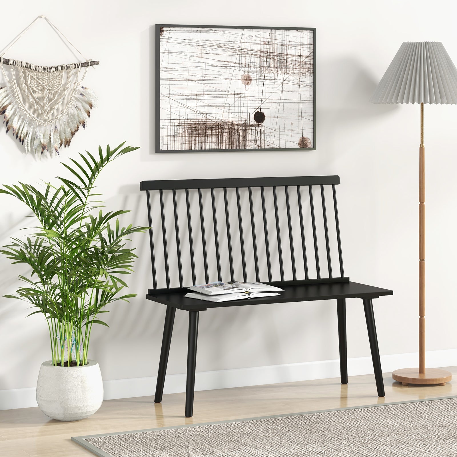 Entryway Bench for 2 with Spindle Back for Kitchen Dining Room Hallway-Black