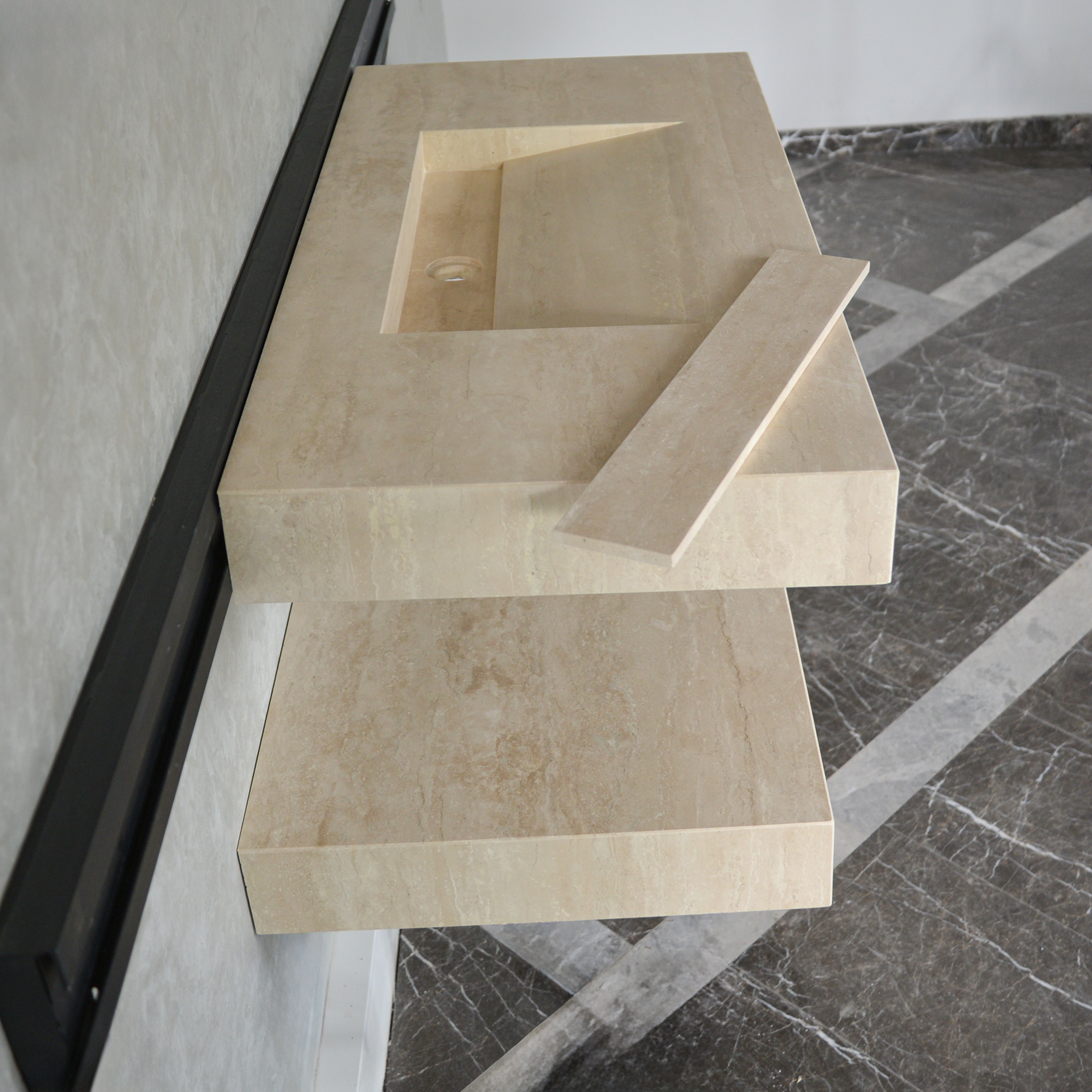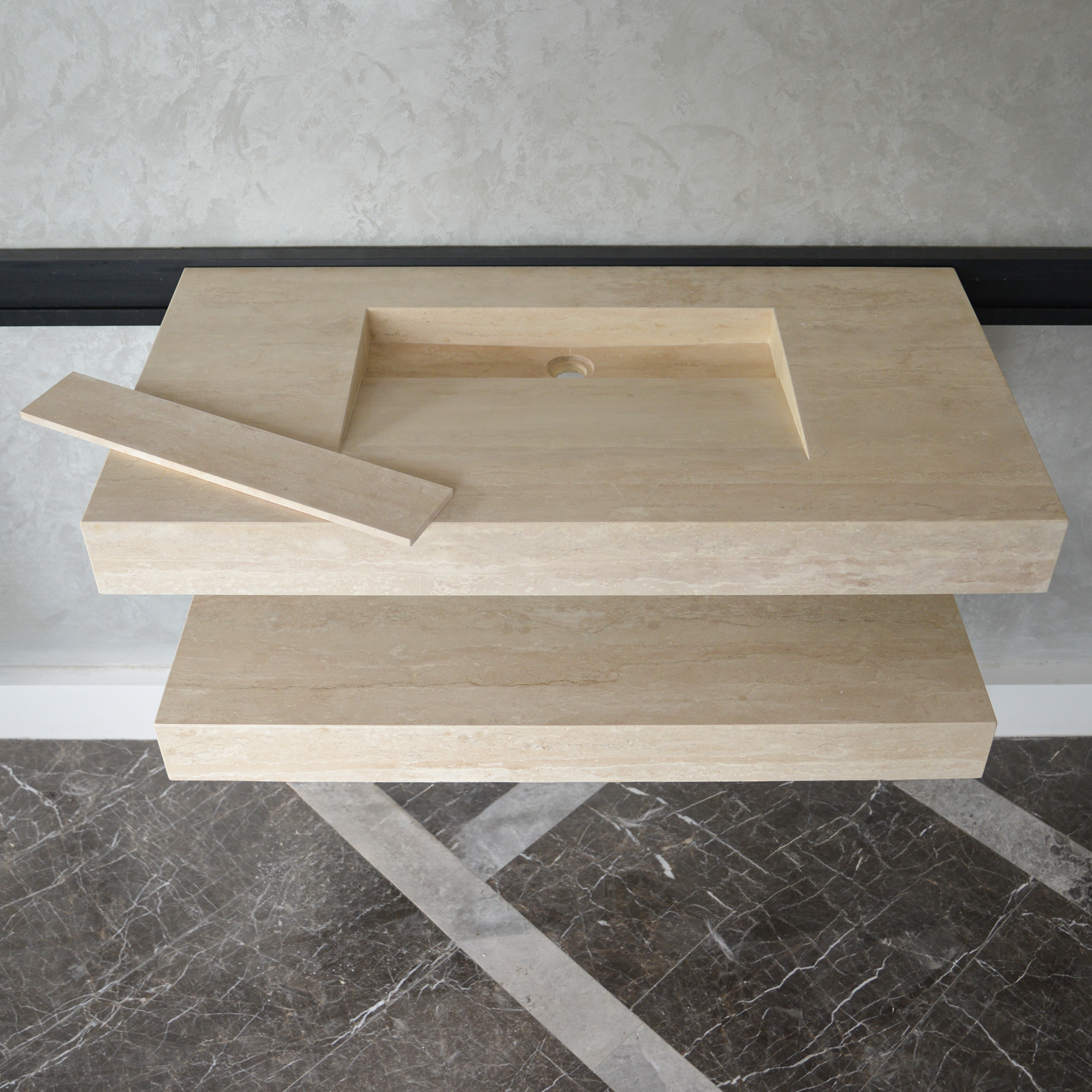 HANDCRAFTED CUSTOM TRAVERTINE SINK AND MATCHING SHELF (TR-095)
