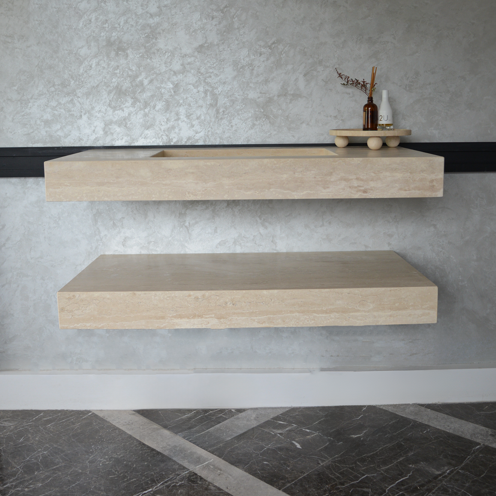 HANDCRAFTED CUSTOM TRAVERTINE SINK AND MATCHING SHELF