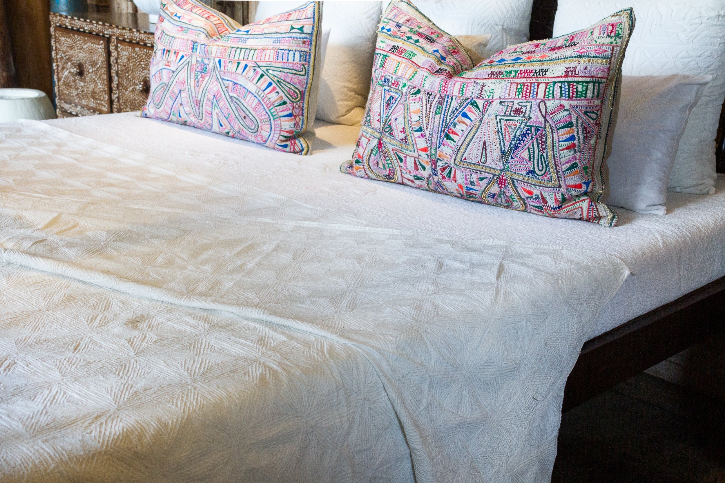 This gorgeous hand-made cotton coverlet featuring a geometric motif created by repeated stitches of white cotton threads.