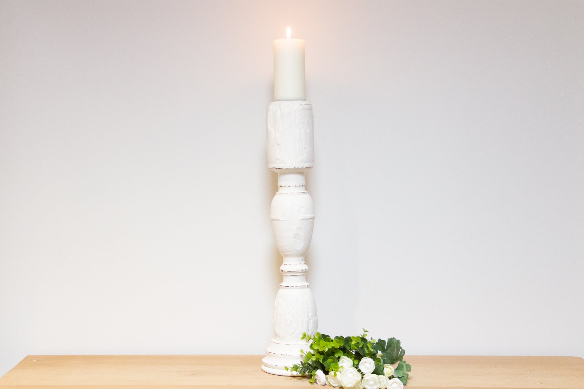 Exquisite tall rustic candle holder, lovingly crafted from a genuine antique bed leg. This unique teak Indian candle holder showcases the timeless beauty of its time adorned with intricate turned work that reflects the artisan's skillful craftsmanship. Its charming aged painted finish adds a touch of vintage allure, making it a standout piece in any setting. Suitable for indoor outdoor use, this candleholder will look lovely as table top decoration or place it on a corner of your room to add an interesting element.