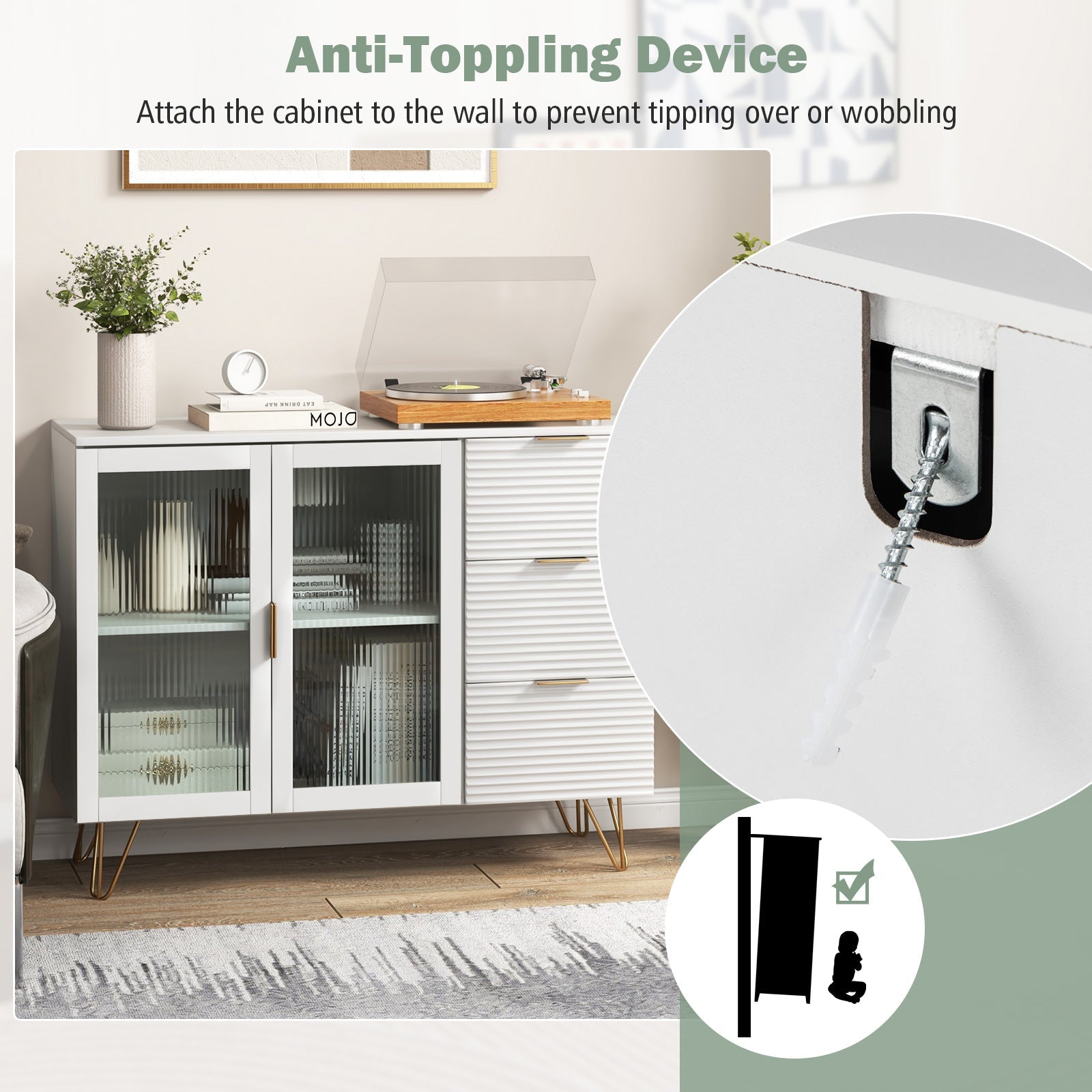 ● Metal support legs at the bottom further enhance stability● 2-tier cabinet and 3 drawers offer ample hidden space to keep items clean● Wide countertop to keep items organized and easily accessible● Tempered glass doors with metal handles allow for easy opening● Attach the cabinet to the wall to prevent it from tipping over● White modern look paired with gold legs for a clean and stylish look● Suitable for living room dining room kitchen entryway etc● Easy-to-clean surface makes daily maintenance a breeze● With 2 boxes. Please start assembly after receive both boxes
