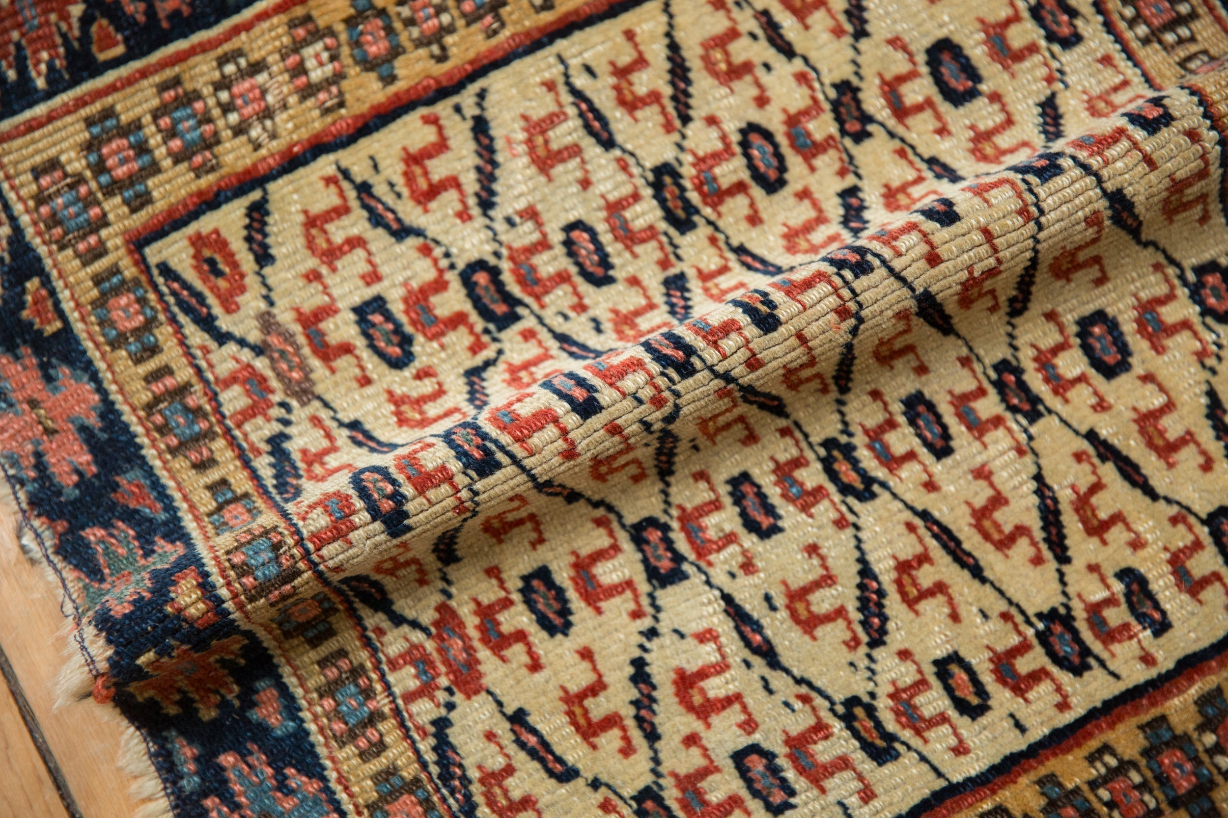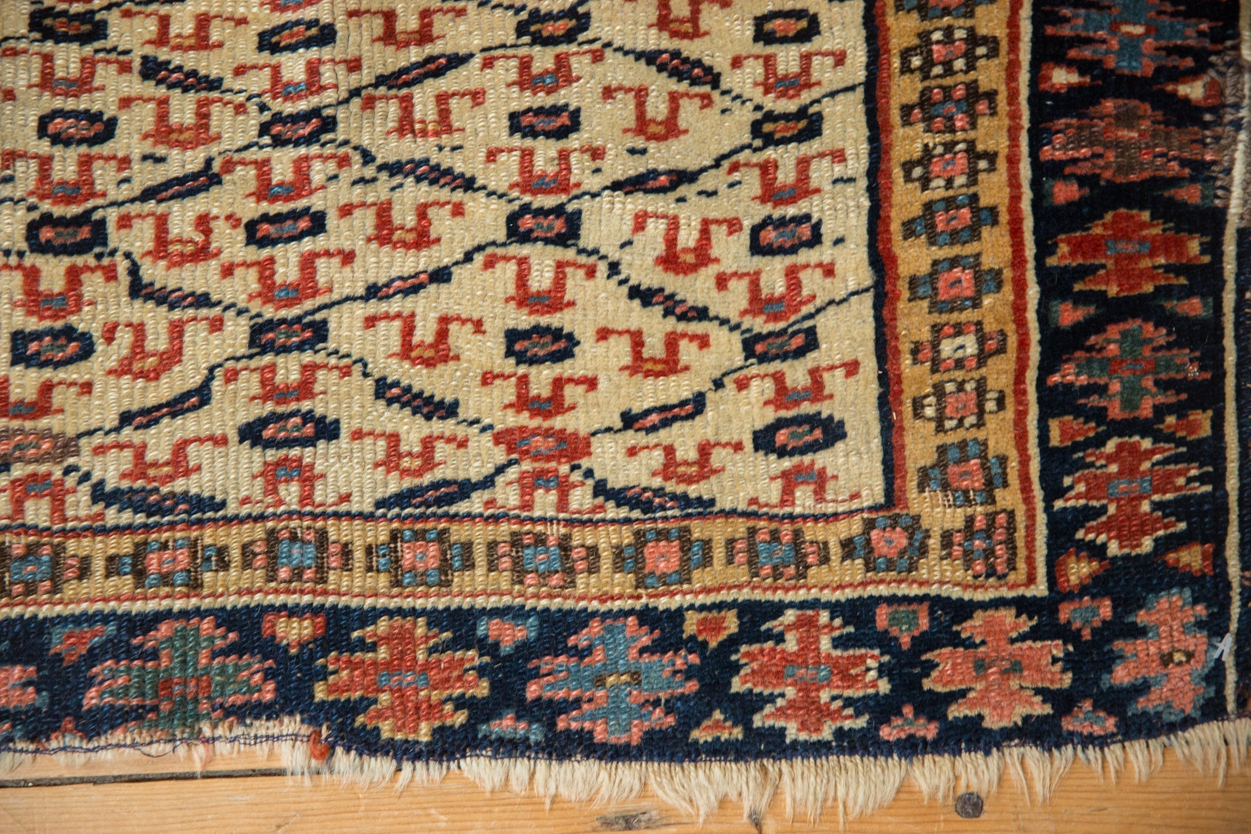 :: Saddlebag allover trellis vine delineating geometric cloudband design elements in each diamond shaped panel wrapped by floral top view simplistic inner minor border rendering. Deeply saturated natural shades in gem-like clarity and brilliance. Colors and shades include: Ivory, ruby red grapefruit, sand, blush, madder root red, sapphire blue, mallard green, navy blue, and more. Condition notes: Even wear across to knot heads with faint foundation showing through. Mostly secure sides and ends. This rug is wider than it is long, and sizes have been inverted from our normal convention to ensure presence in our size range search filter. Multiple areas of repairs with in varying degrees of expertise. One thread bare area of selvage approximately two inches. Some tatter and loss to the ends. Recently professionally cleaned ready for in-home use! Many years of enjoyment to come with this hand knotted Kurdish square rug mat made in Kurdistan circa 1890's vintage. Size measures 1'8" x 2'2".