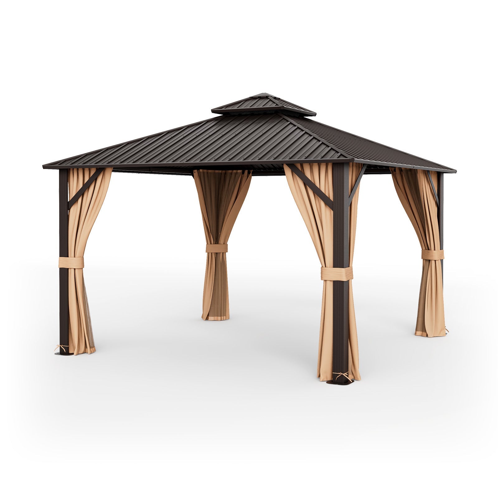 12 x 12 Feet Double-Roof Patio Hardtop Gazebo with Galvanized Steel Roof Netting and Curtains-Coffee