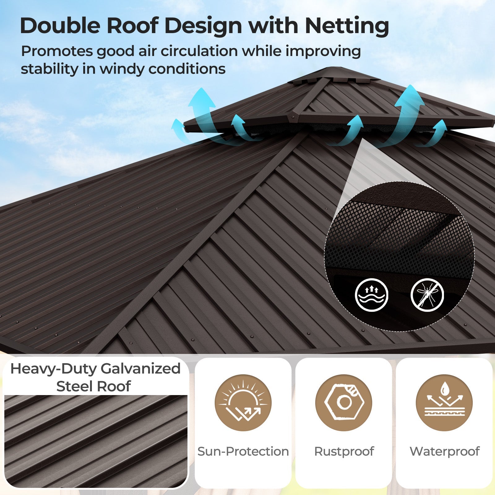 ● The galvanized steel roof is weather-resistant and durable and can be used for all seasons● Features overhang eave design for easy drainage the tilted roof prevents water accumulation● The double roof design keeps the inside cool and comfortable while enhancing stability● The 4" thick aluminum columns offer a solid and stable structure● The expansion screws help fix the gazebo on solid ground for better wind resistance● Features detachable hanging curtains and netting on smooth dual rails● With 2-in-1 loop straps feature full-open design provide optimal ventilation and view● The mesh netting and privacy curtains with convenient zippers provide easy access● The top hanging hook provides additional convenience for hanging a light or fan● The product is divided into 3 boxes and you may receive each box at different times. Please be patient to wait. The screw kit is in BOX