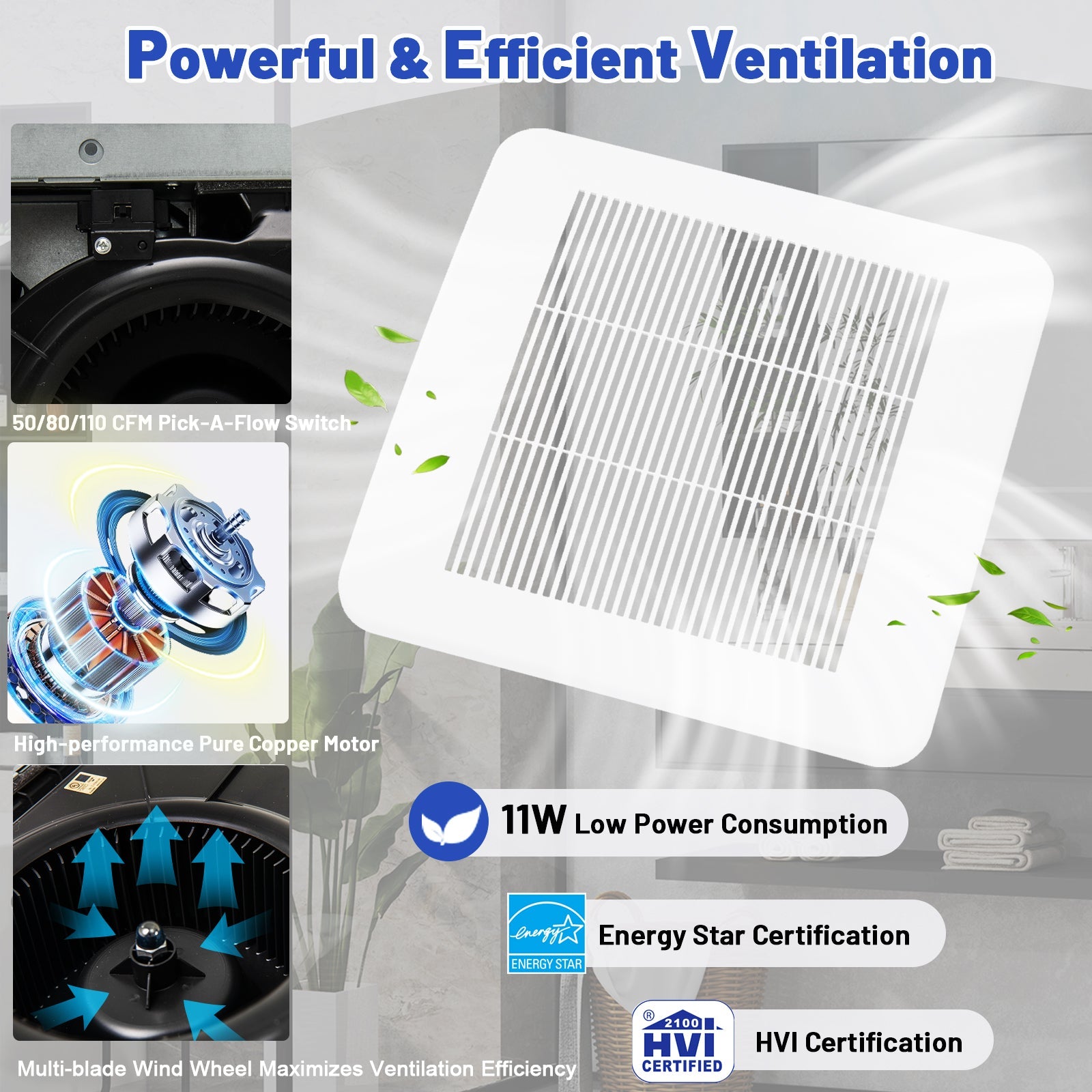 ● 50/80/110 CFM large airflow capacity for enclosed room up to 50-120 sq. ft● 0.3/0.8/1.5 sones low noise won't disrupt the tranquility of your bathroom ● Galvanized sheet housing for longevity and continued performance● Multi-blade wind wheel maximizes ventilation efficiency ● Advanced check valve to avoid backflow of dirty air ● 2 ways to install: joist mounting or wall mounting● With both Energy Star and HVI certifications for reliable use● Wiring diagram: black-lead wire green-ground wire white-neutral wire