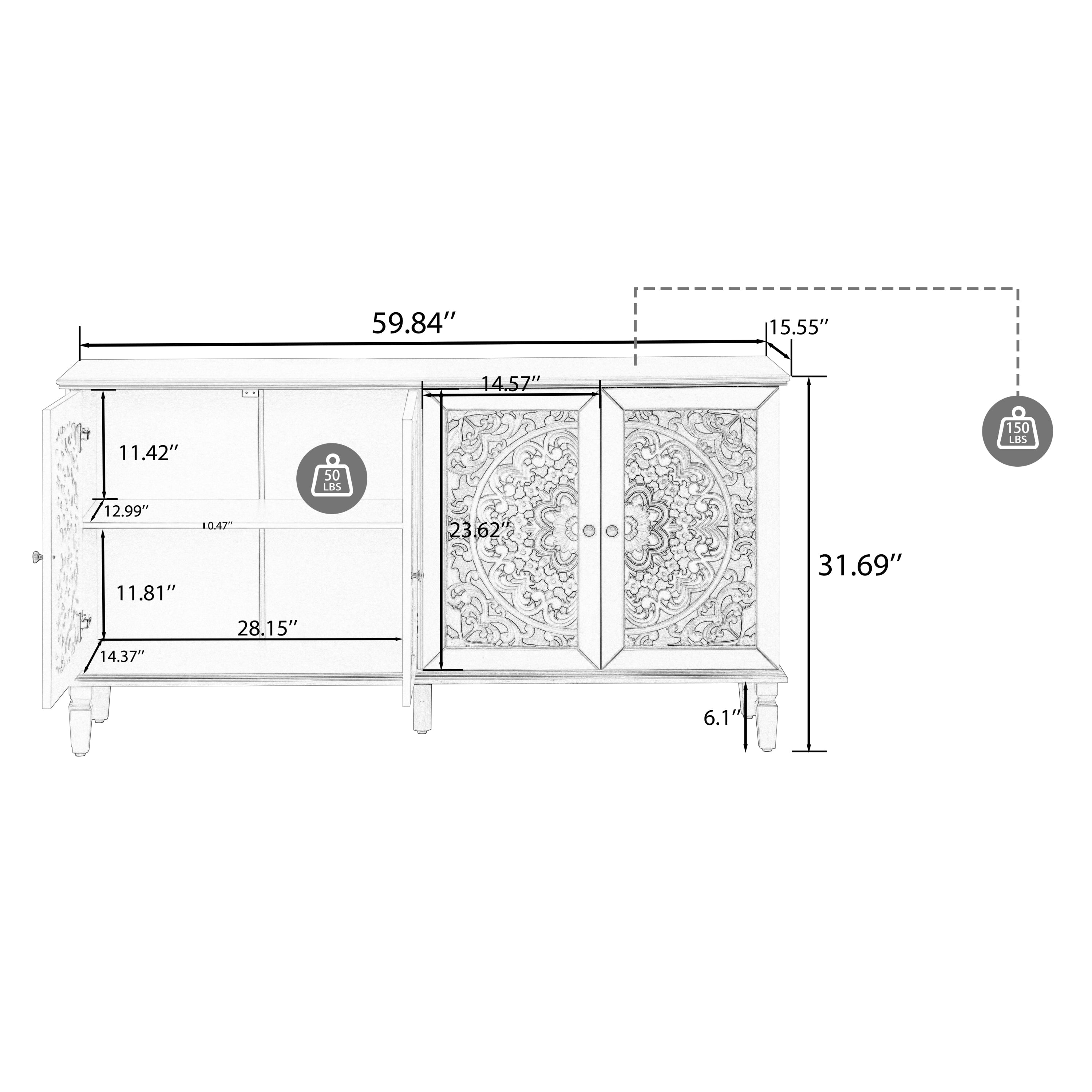 This 60-inch antique buffet cabinet features detailed floral carvings and solid wood legs, ideal for living rooms, dining rooms, or entryways. It offers both vintage style and practical storage with media display functionality.