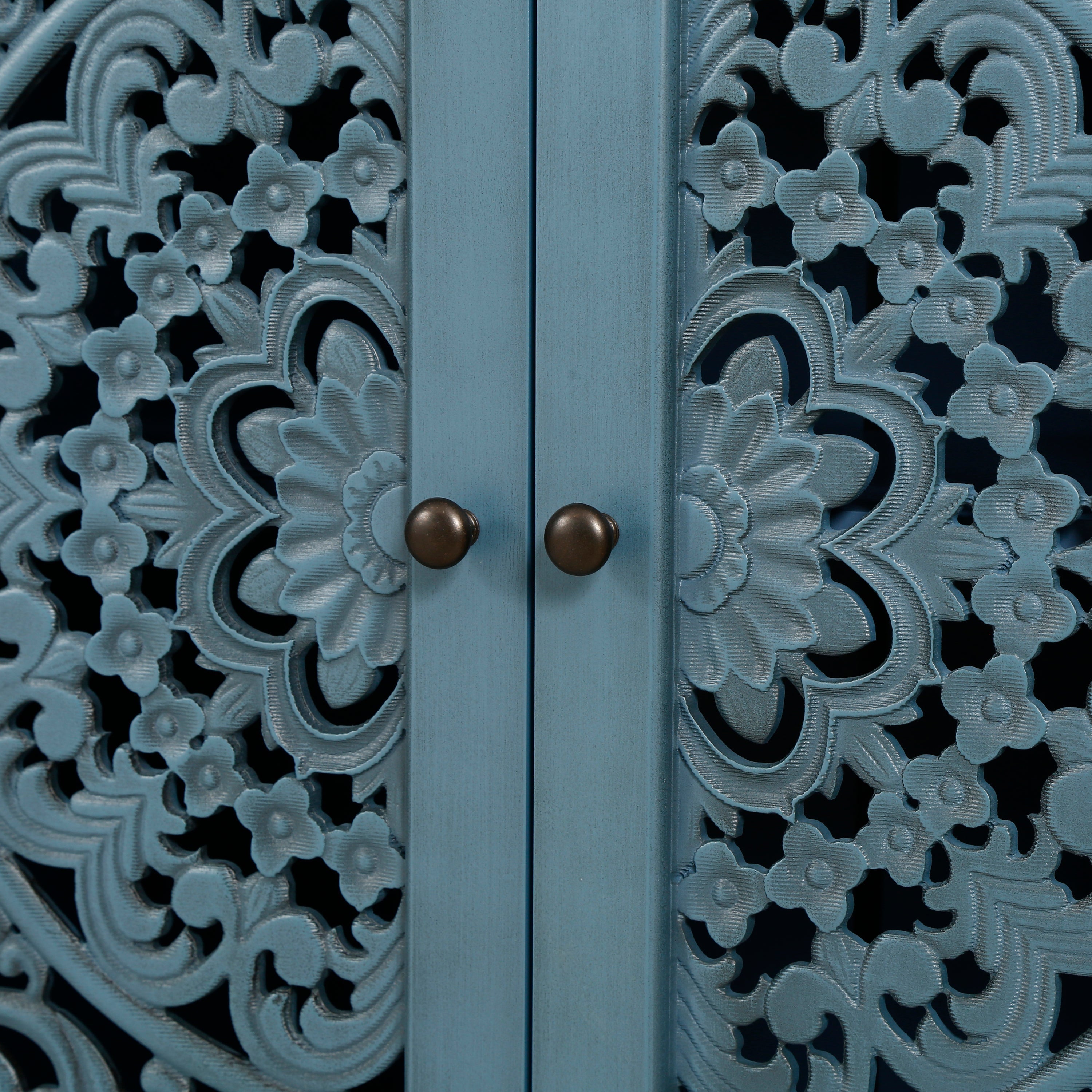 Antique 60-inch buffet cabinet by HouseOfZazla with floral carvings and adjustable shelves for versatile storage.Antique 60-inch buffet cabinet by HouseOfZazla with floral carvings and adjustable shelves for versatile storage.