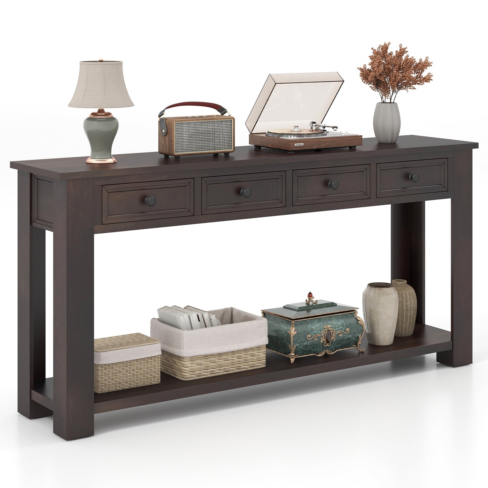 63 Inches Farmhouse Entryway Table with 4 Storage Drawers and Open Shelf-Espresso