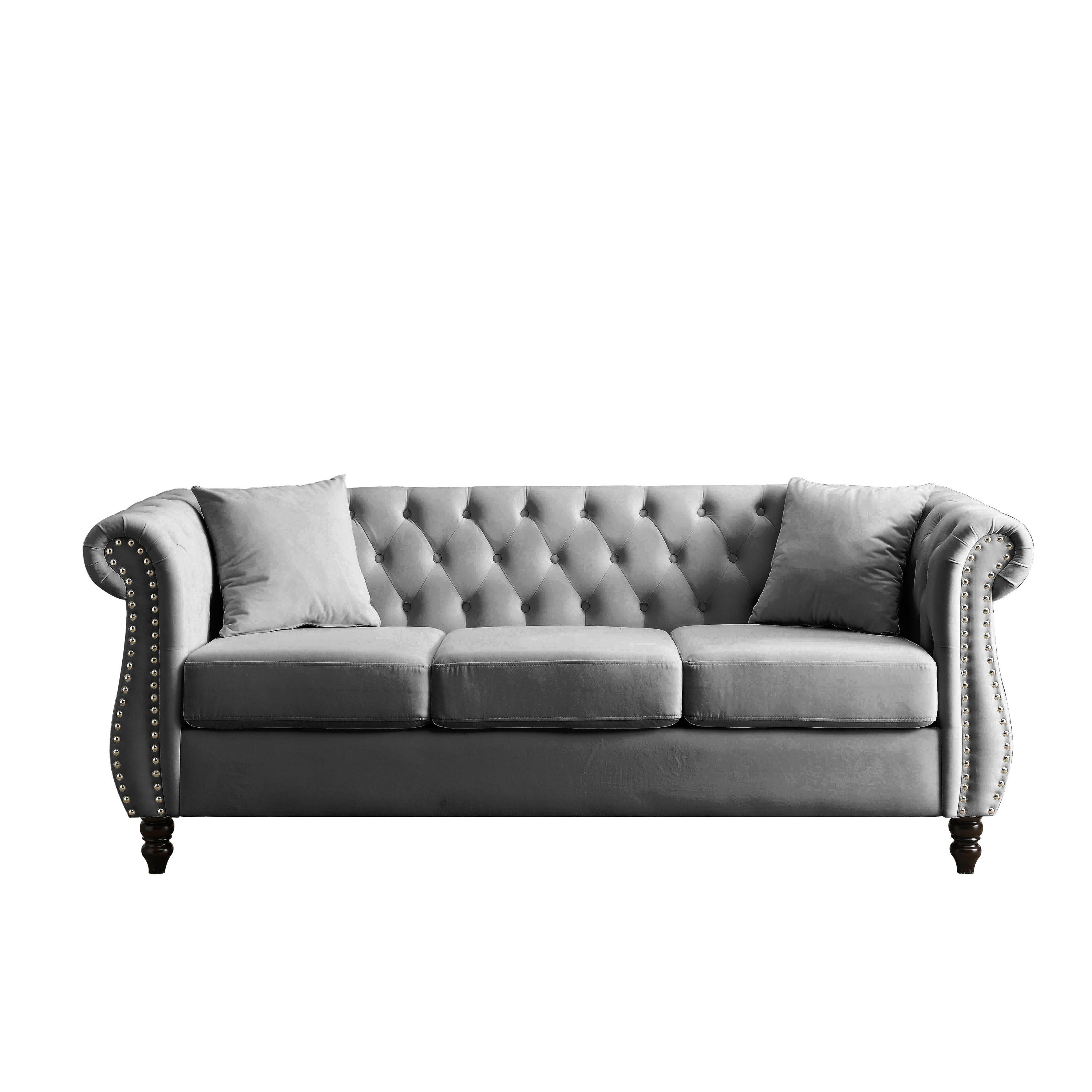 This 80-inch Chesterfield sofa features a timeless design with grey velvet upholstery, ideal for living rooms, bedrooms, or offices seeking a sophisticated and comfortable seating option.