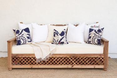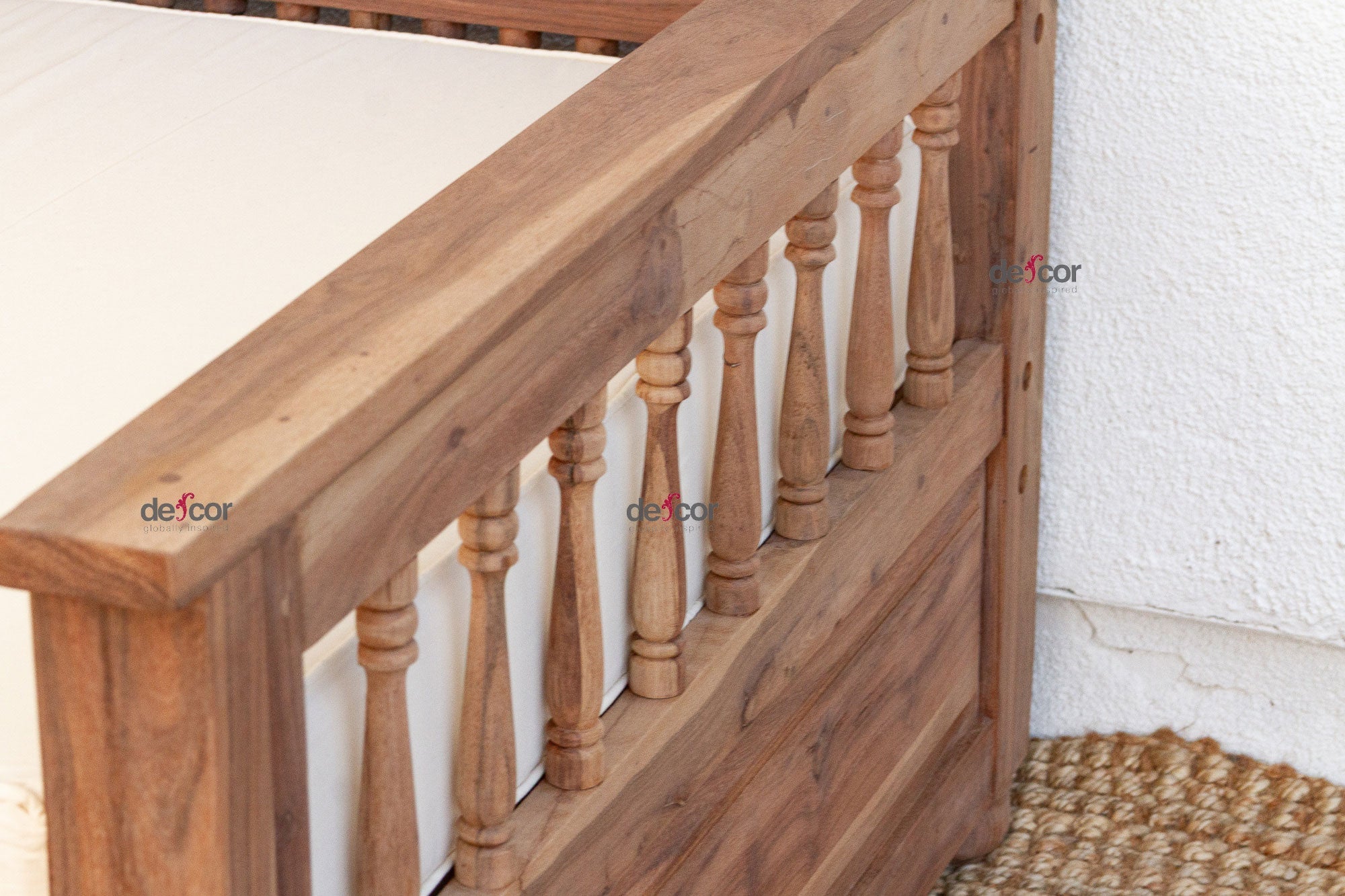 An exotic Moroccan-inspired daybed with a Mousharabi lattice design. Mousharabi, is a traditional architectural element found in Morocco. It refers to a type of intricate lattice or screen design often used to provide privacy, filter sunlight, and create decorative patterns. Crafted from reclaimed teak wood with a chalk white finish, this hand-carved daybed exudes elegance and authenticity. The intricate Mousharabi lattice work on the back and front adds a touch of exotic beauty, while the open spindle work on the side panels enhances its visual appeal. Complete with a custom medium-density foam cushion, this grand lounge daybed offers both comfort and style.