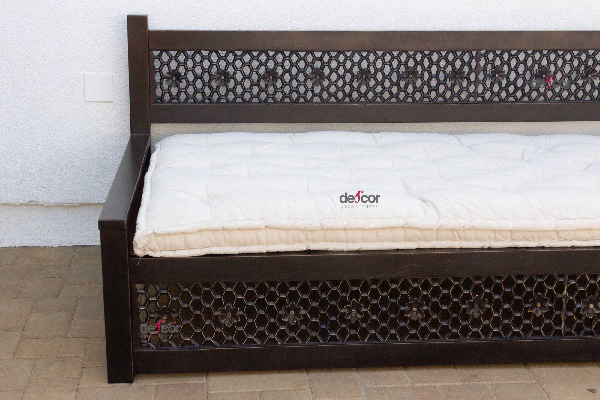 Inspired by ancient Moorish architecture, our custom Jali sofa daybed features a finely carved see-through floral panel combined with clean modern lines. This Moorish inspired daybed sofa has a custom tufted mattress with cotton canvas cover. A fun bohemian yet classic sofa made from reclaimed teak wood with a distressed black painted finish.