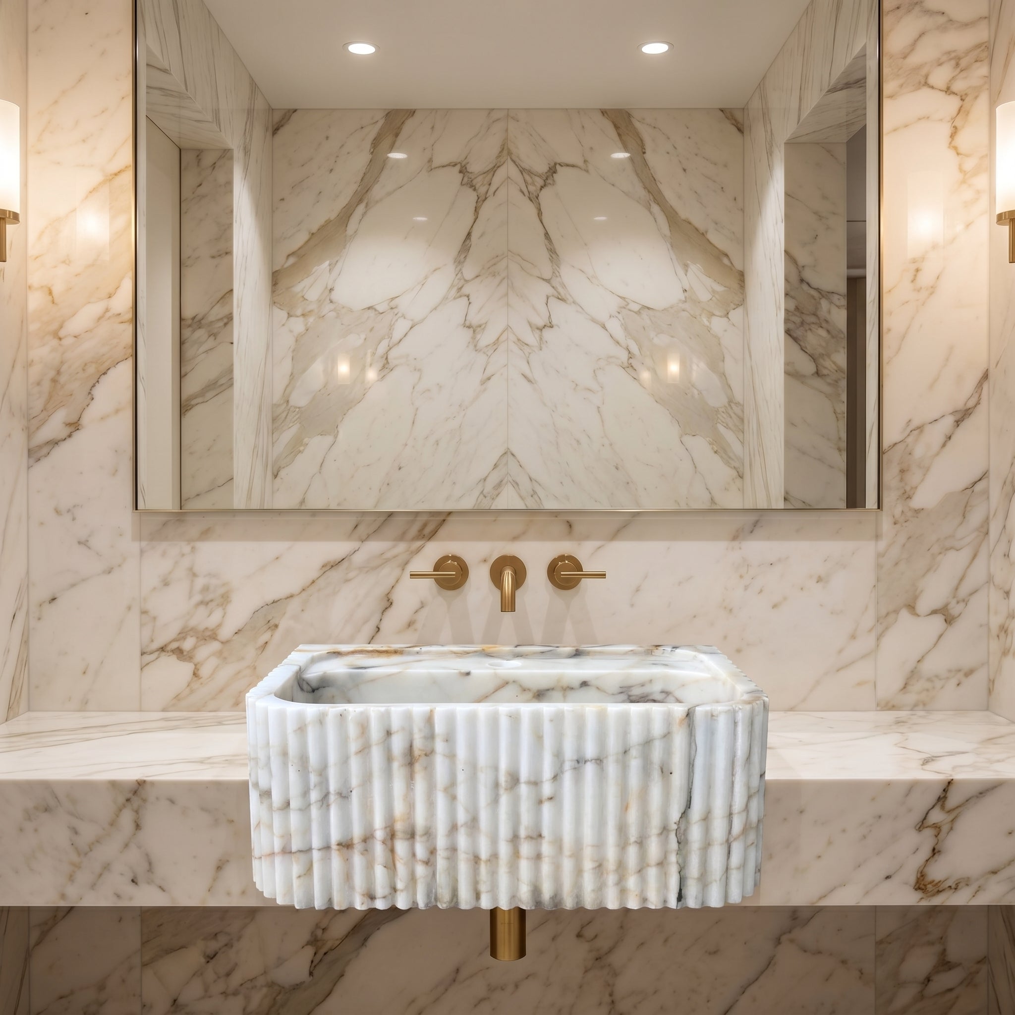 Calacatta Gold Marble Wall-mount Bathroom Vanity Sink Fluted (W)18" (L)36" (H)7" is carved from Solid Block is handcrafted in Turkey.