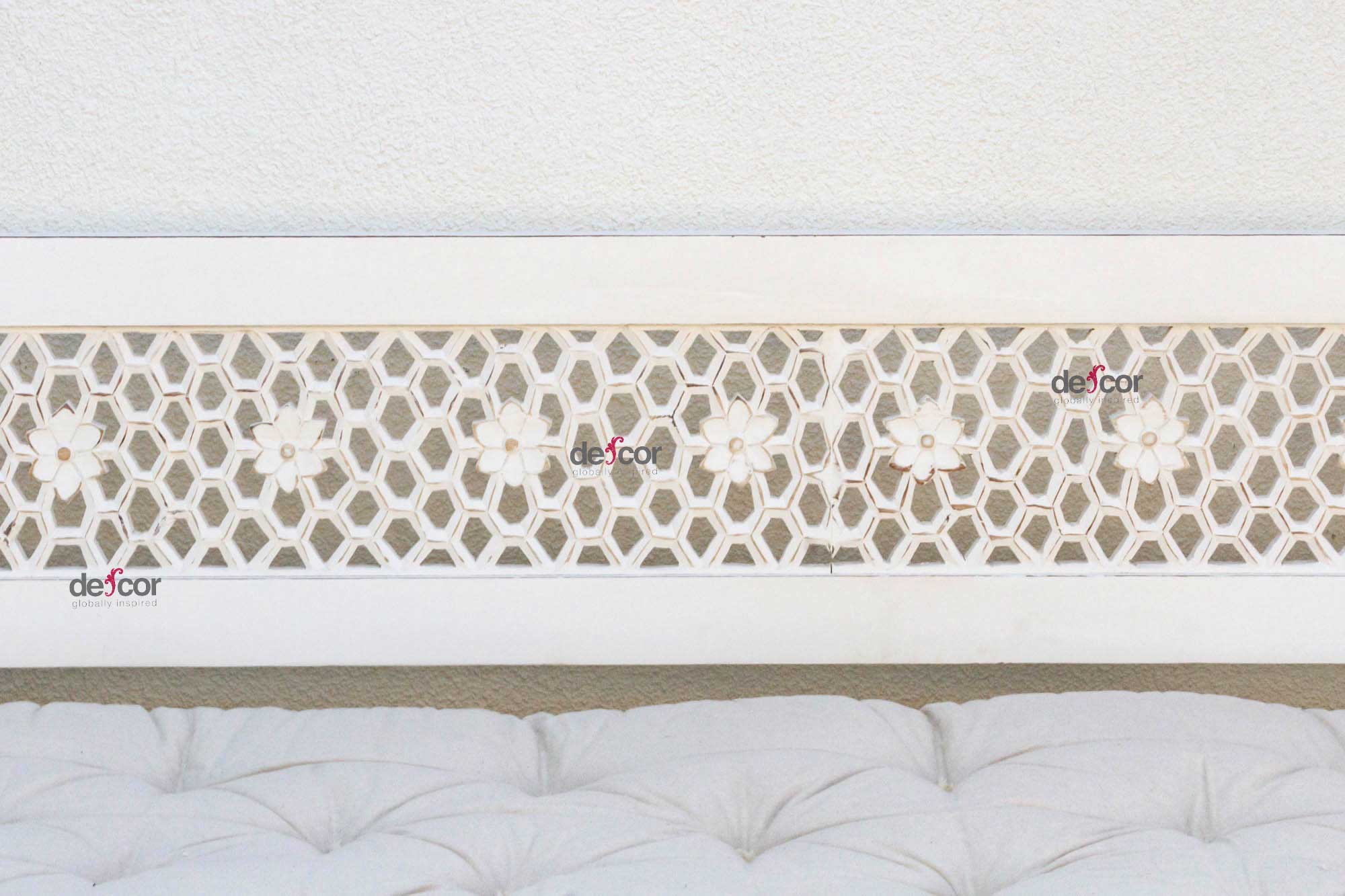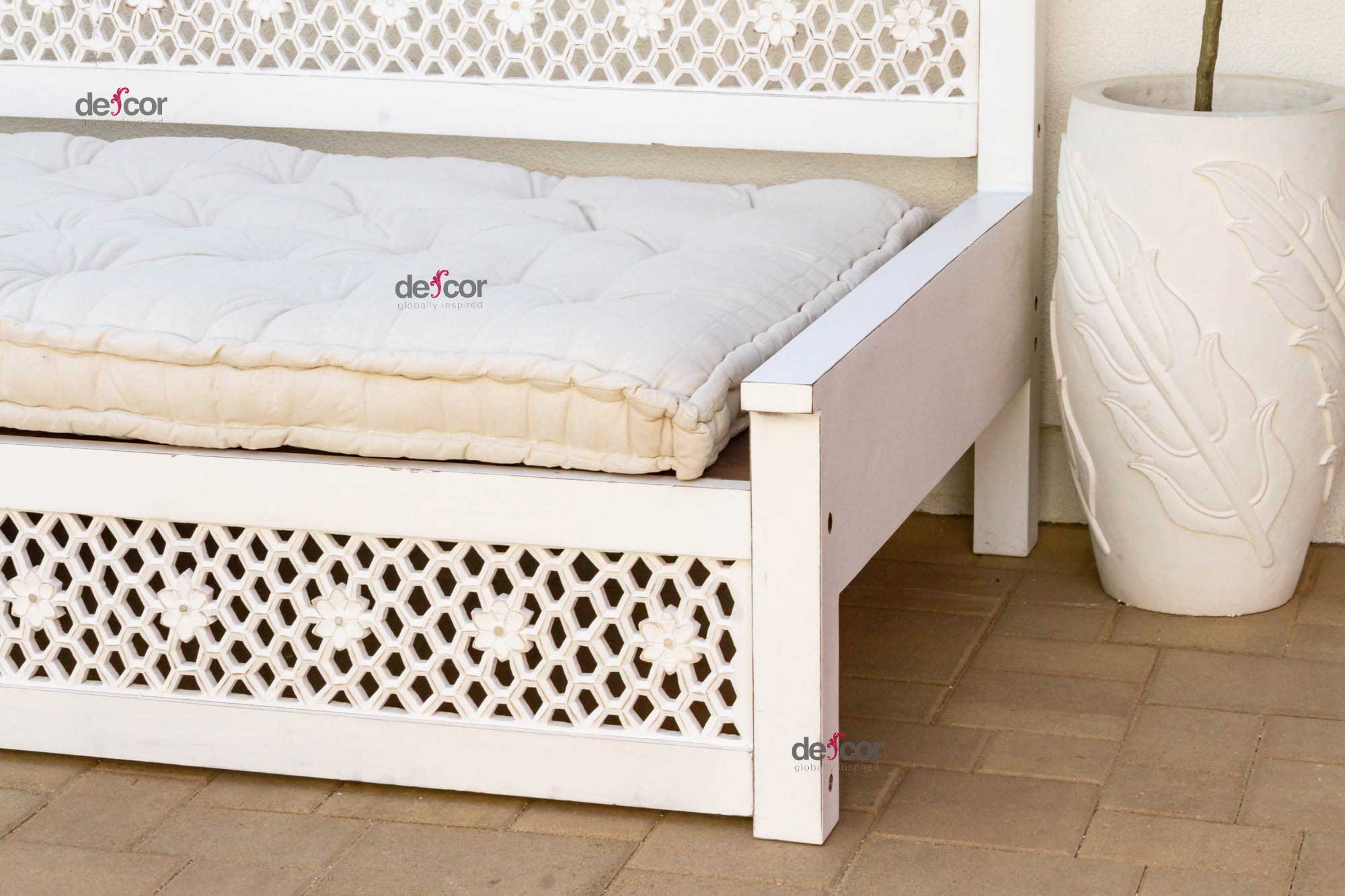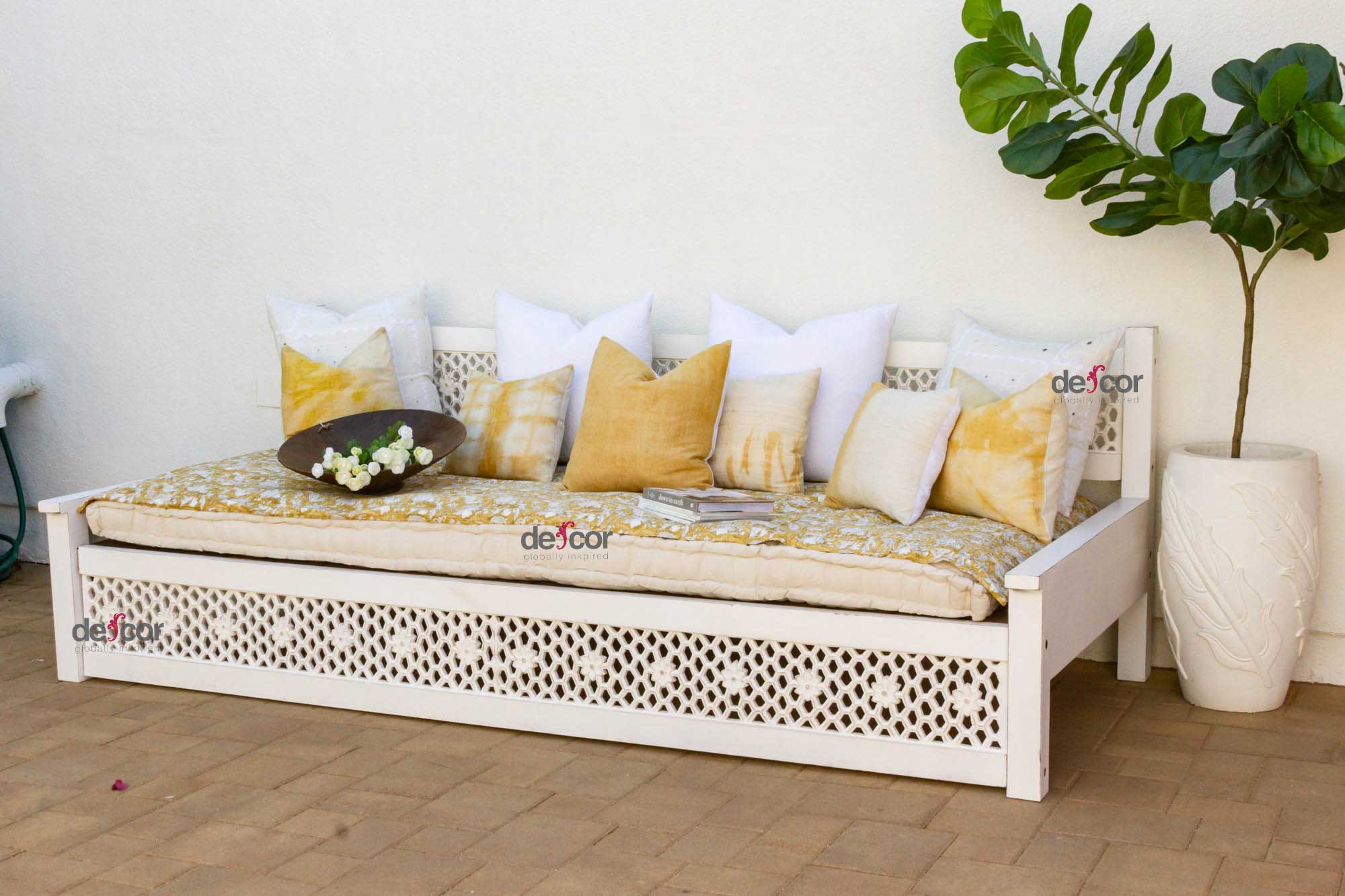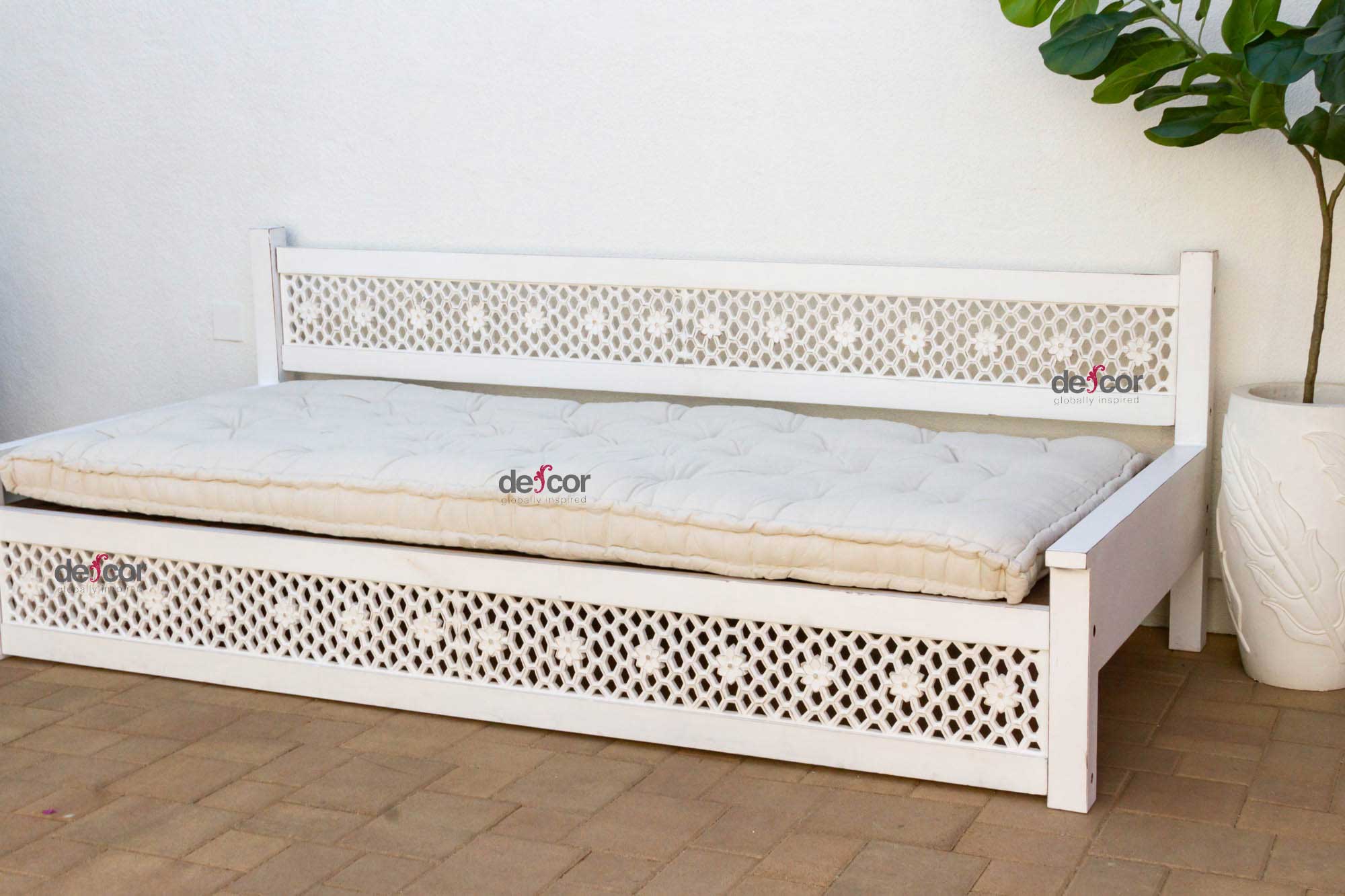 Inspired by ancient Moorish architecture, our custom Jali sofa daybed features a finely carved see-through floral panel combined with clean modern lines. This Moorish inspired daybed sofa has a custom tufted mattress with cotton canvas cover. A fun bohemian yet classic sofa made from reclaimed teak wood with a distressed white painted finish.