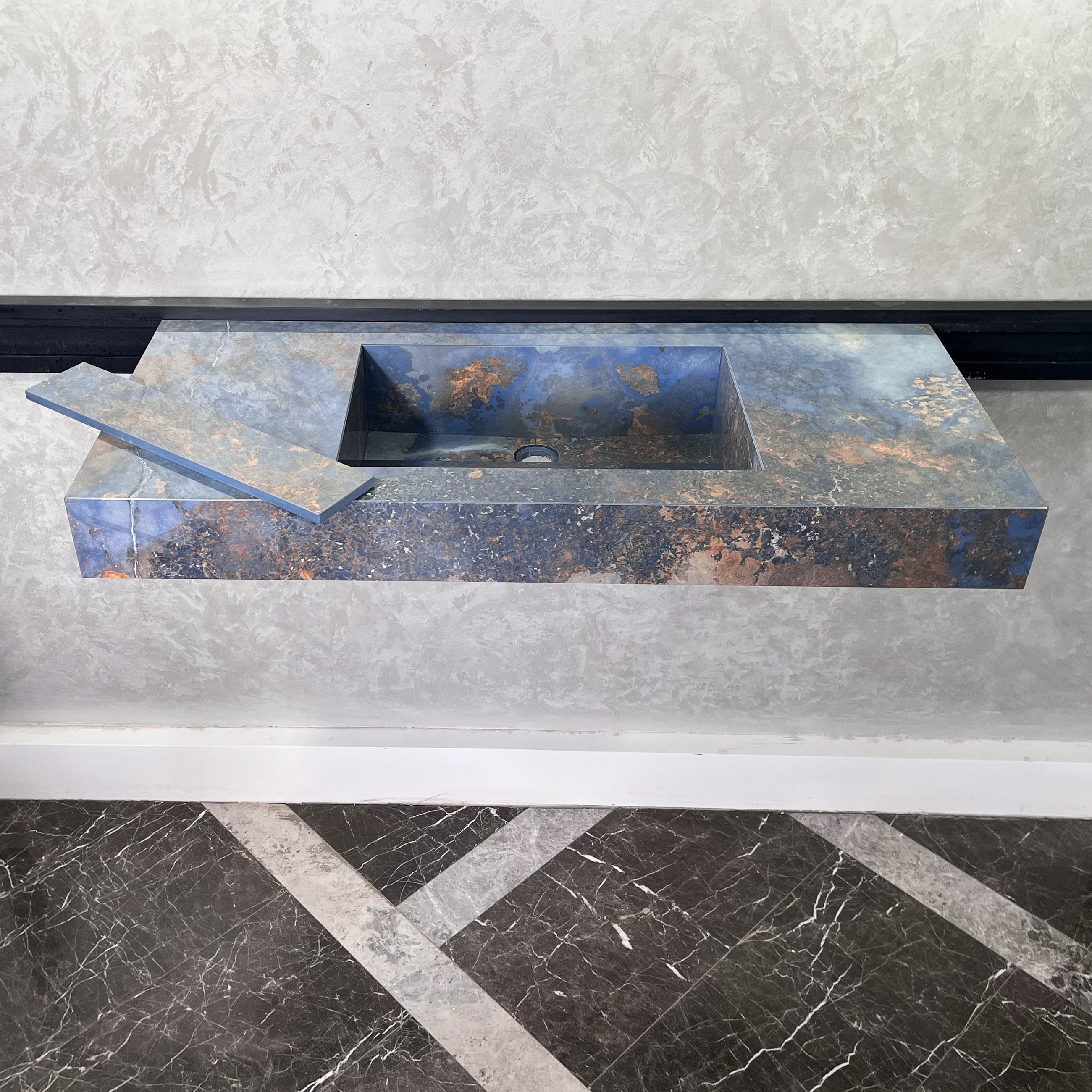 This high engineered porcelain sink was cut and assembled by hand delicately. Thanks to the latest innovations in technology, it is possible to combine the beauty of natural stone appearance and imperviability. It is a long lasting and very durable material and absolutely safe for food.