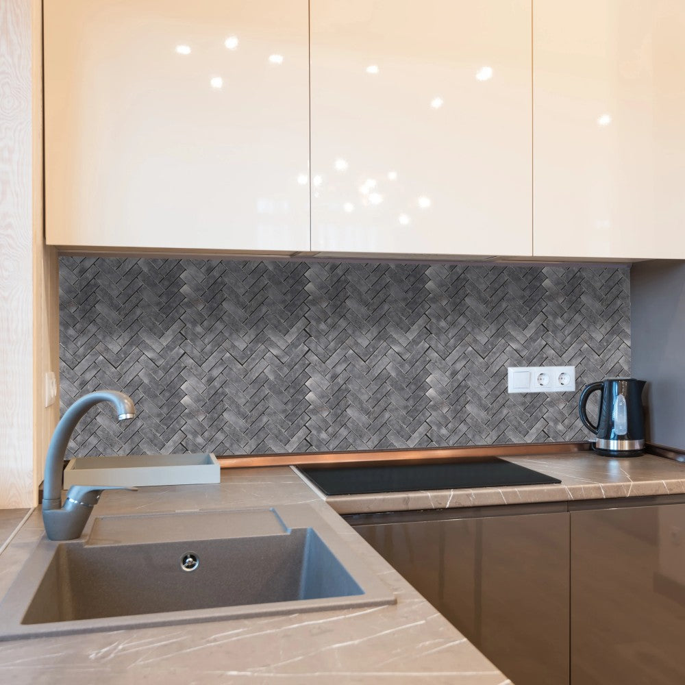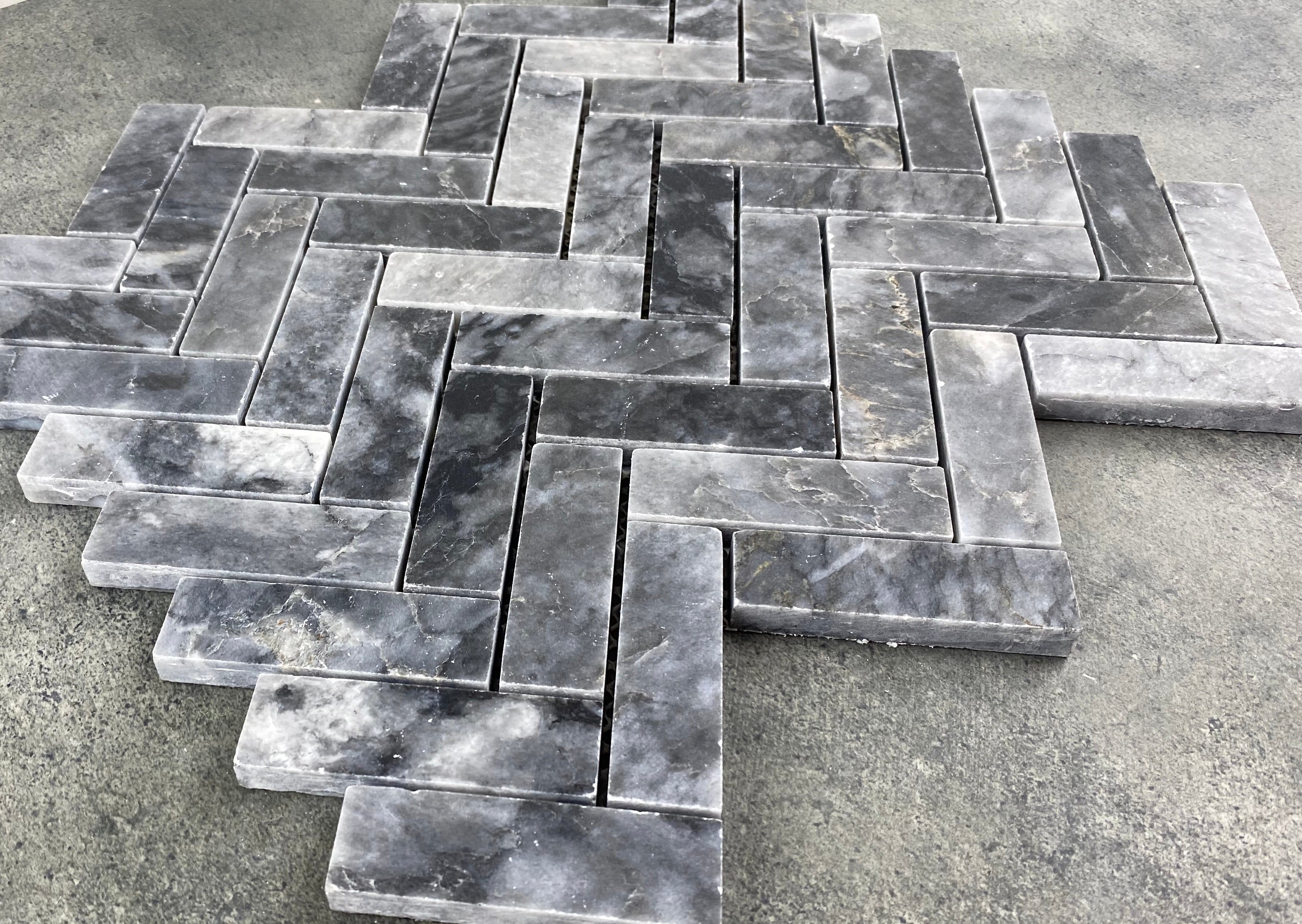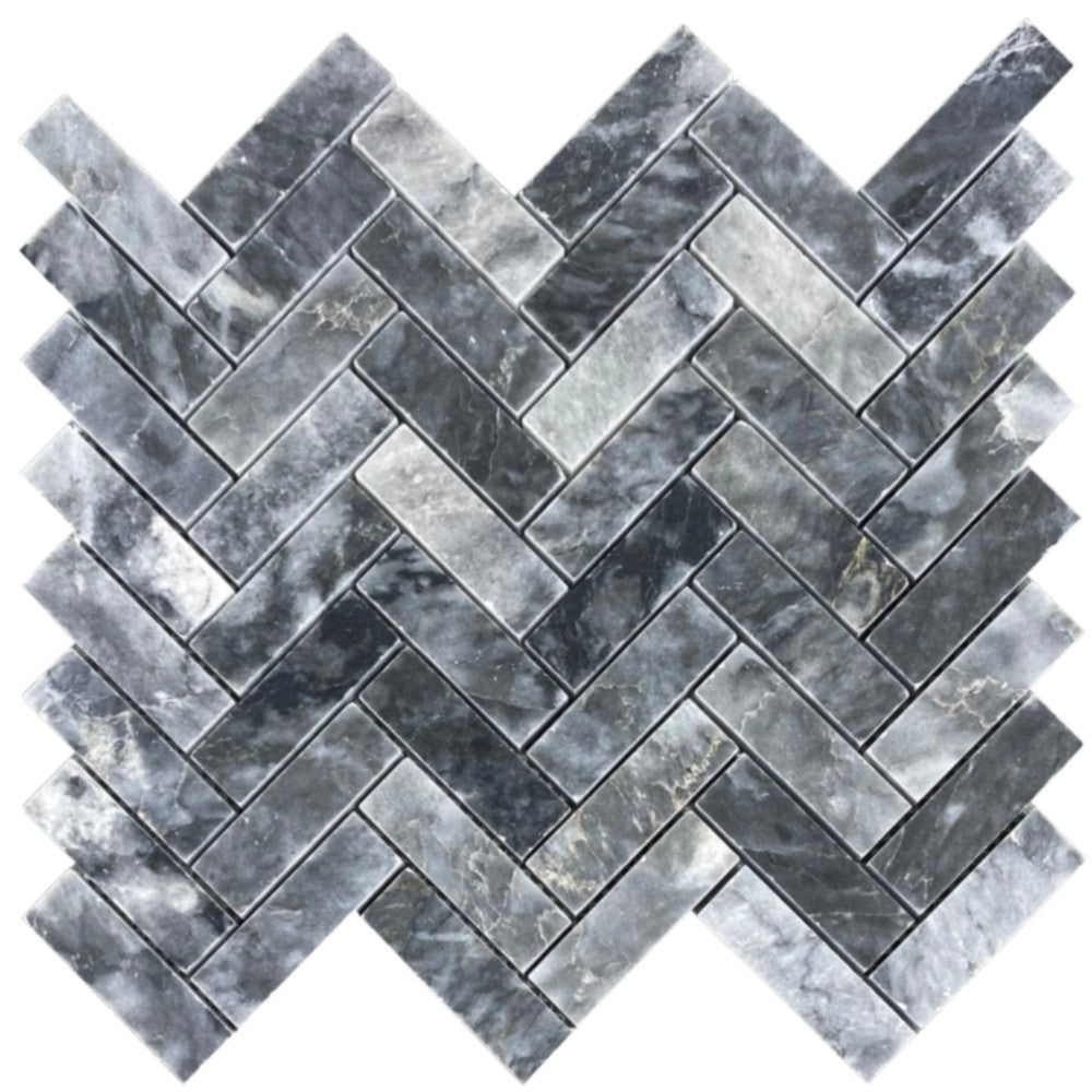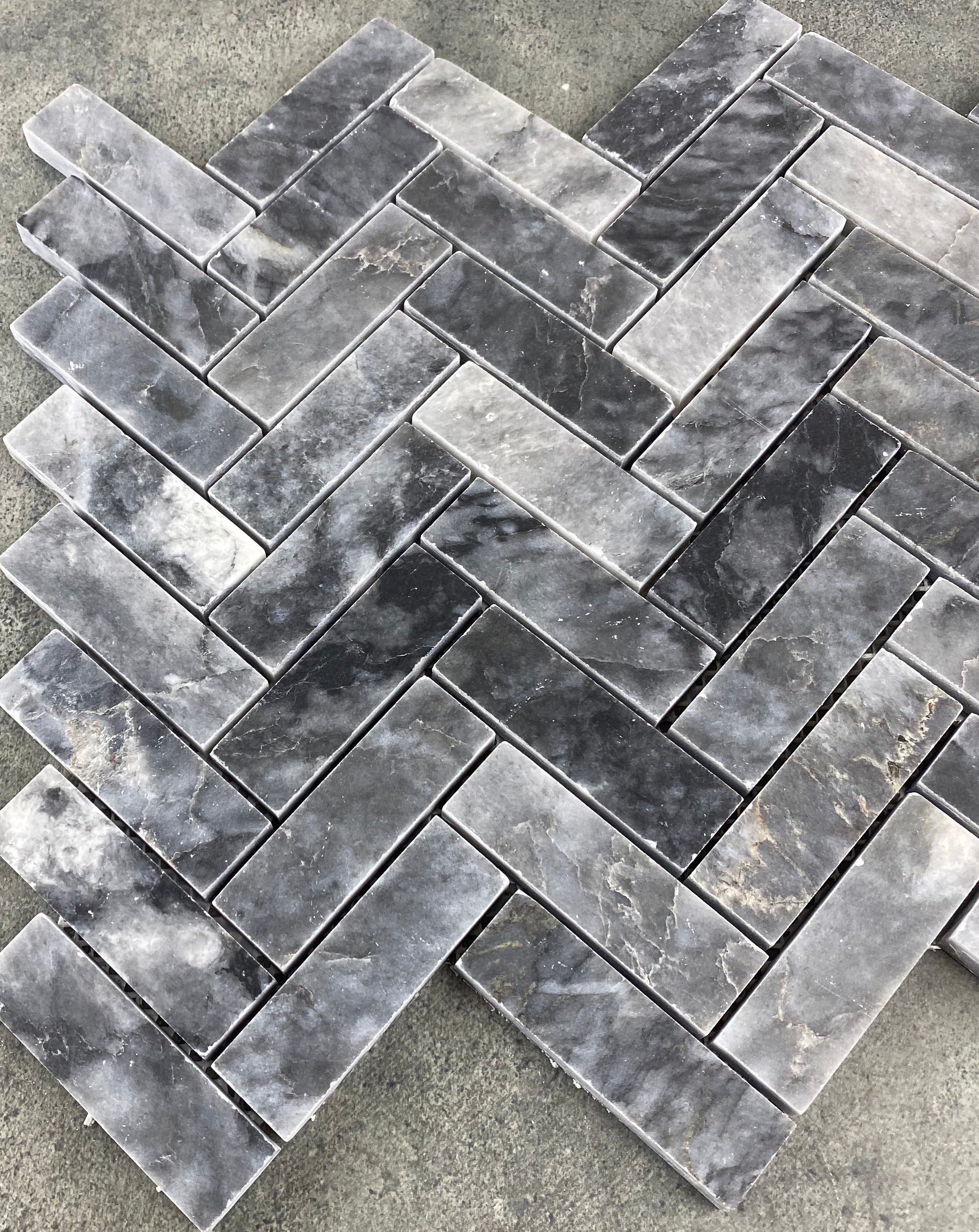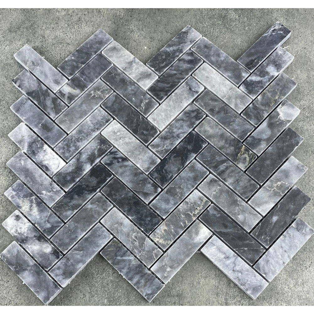 Luna Sky Marble 1"x3" Herringbone Marble Mosaics have a soft combination of grey and white color. This mosaic tile has a marble base and is honed finish.