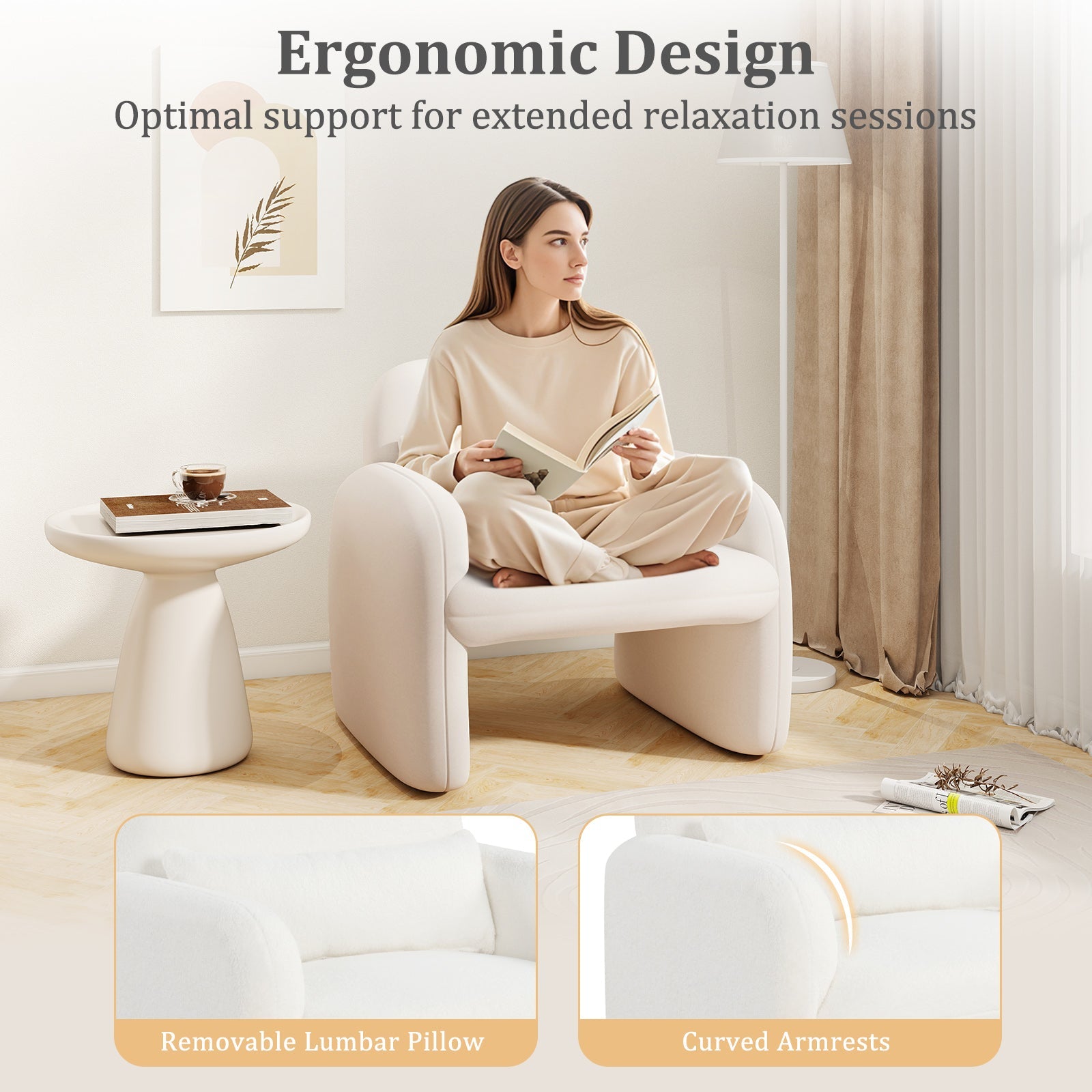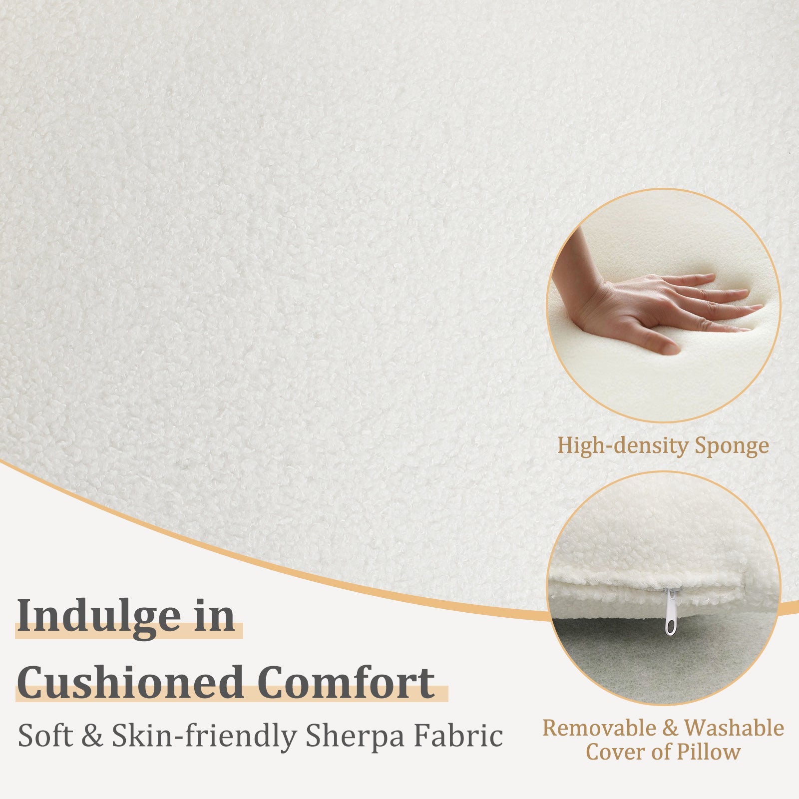 ● Indulge in cushioned comfort and soft sherpa upholstery● Ergonomic armrests offer great support and relaxation● Included waist pillow for enhanced lumbar support● Sturdy and long-lasting wooden frame withstands daily use ● Non-slip foot pads increase stability and protect the floor● Modern style adds a touch of elegance to any living space● Zippered pillow cover for easy removal and cleaning ● Effortless assembly no tools required