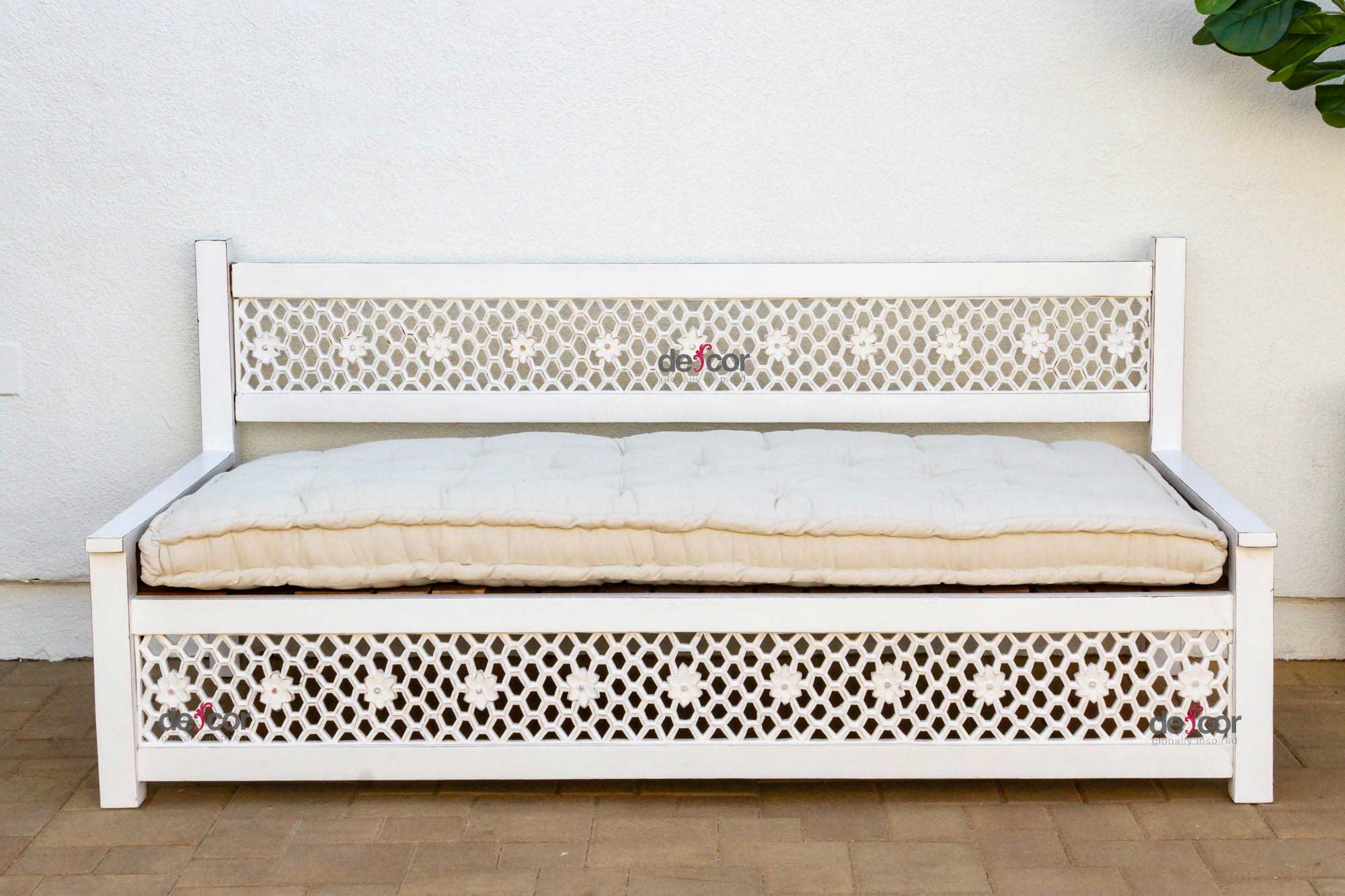 Inspired by ancient Moorish architecture, our custom Jali sofa daybed features a finely carved see-through floral panel combined with clean modern lines. This Moorish inspired daybed sofa has a custom tufted mattress with cotton canvas cover. A fun bohemian yet classic sofa made from reclaimed teak wood with a distressed white painted finish.