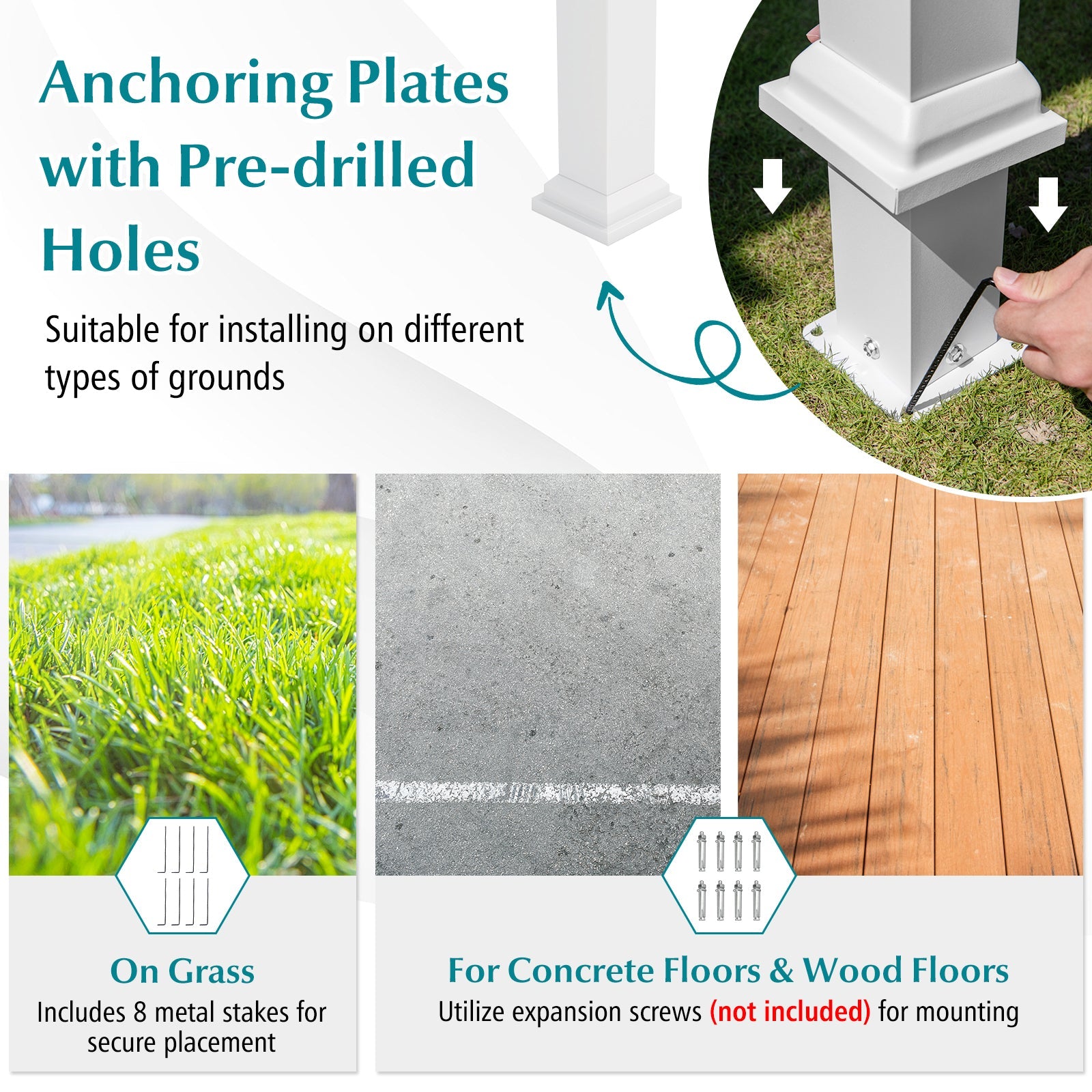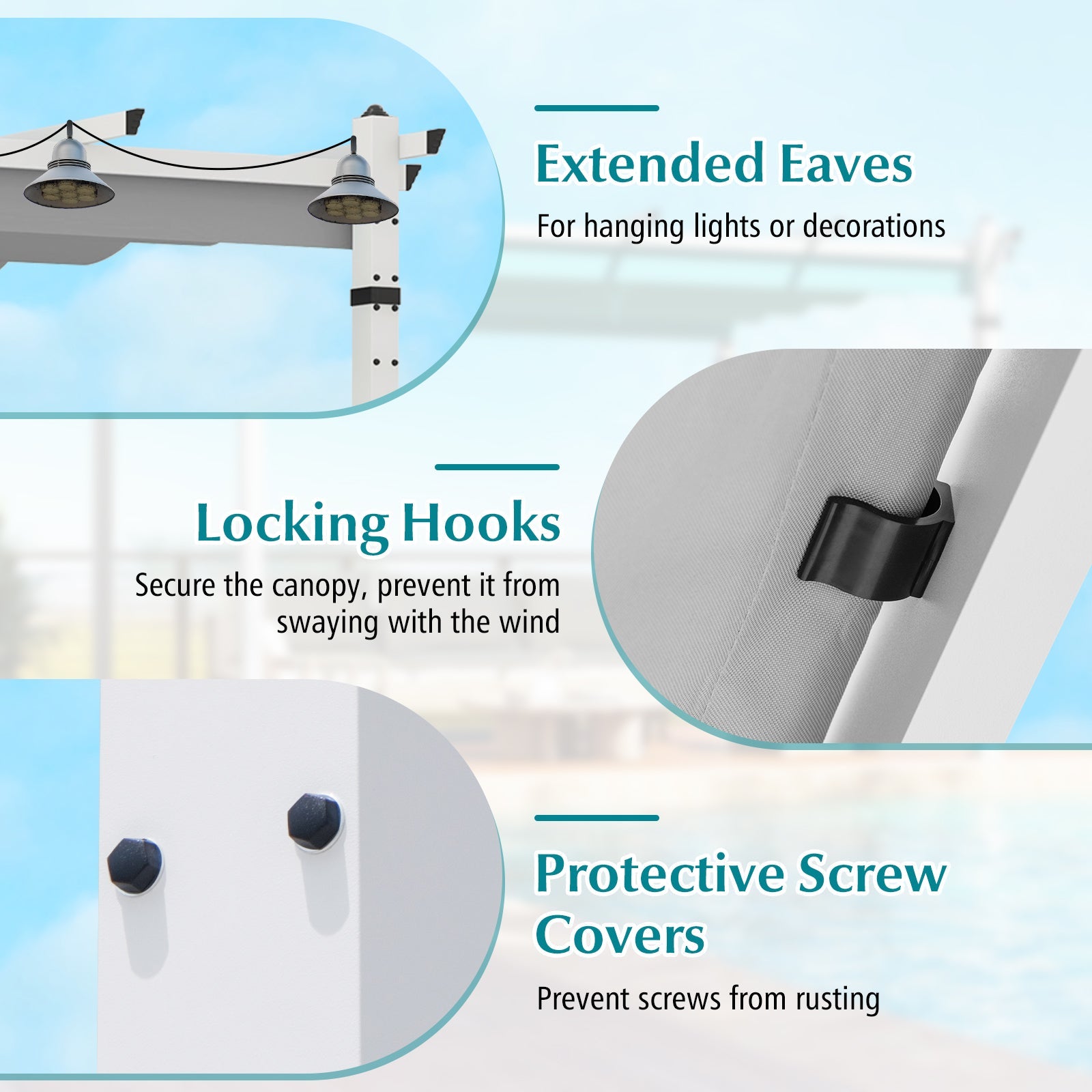 ● Supported by powder-coated aluminum poles not easy to rust peel or chip● Adopts 3.2” x 3.2”/80 x 80 mm thick supporting columns sturdy and reliable● With anchoring plates and pre-drilled holes can be secured on the ground● Equipped with 8 metal stakes for securing on soft ground● With a retractable canopy adapt to changing weather conditions● Easy to fold and unfold the canopy by pulling the rope loop and rolling pulleys● The premium polyester canopy is resistant to sunlight water and fading● Comes with extended eaves suitable for hanging lights and decorations● Features locking hooks to secure the canopy on windy days● Protective screw covers to prevent screws from rusting