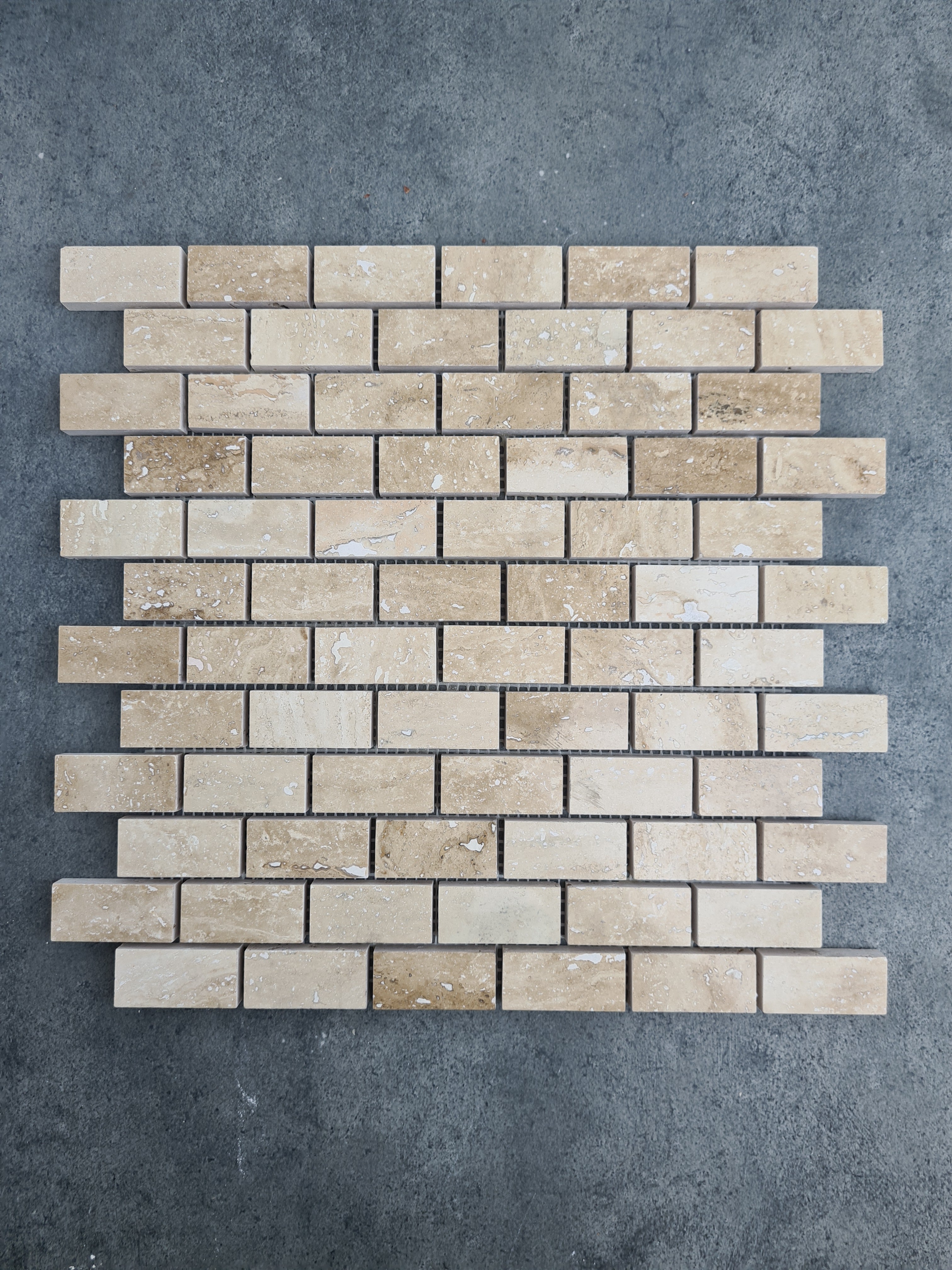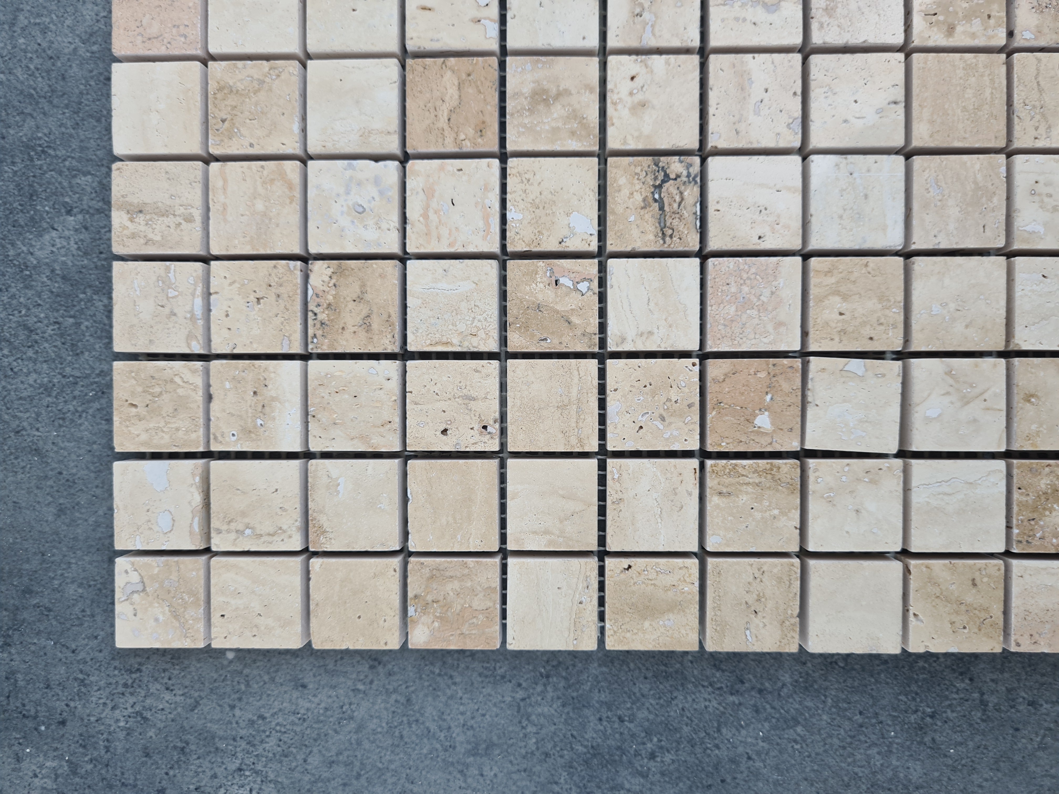 Patara 12" x 12" Honed Travertine Mesh-Mounted Mosaics have a soft combination of walnut color. This mosaic tile has a travertine base and a honed surface finish.