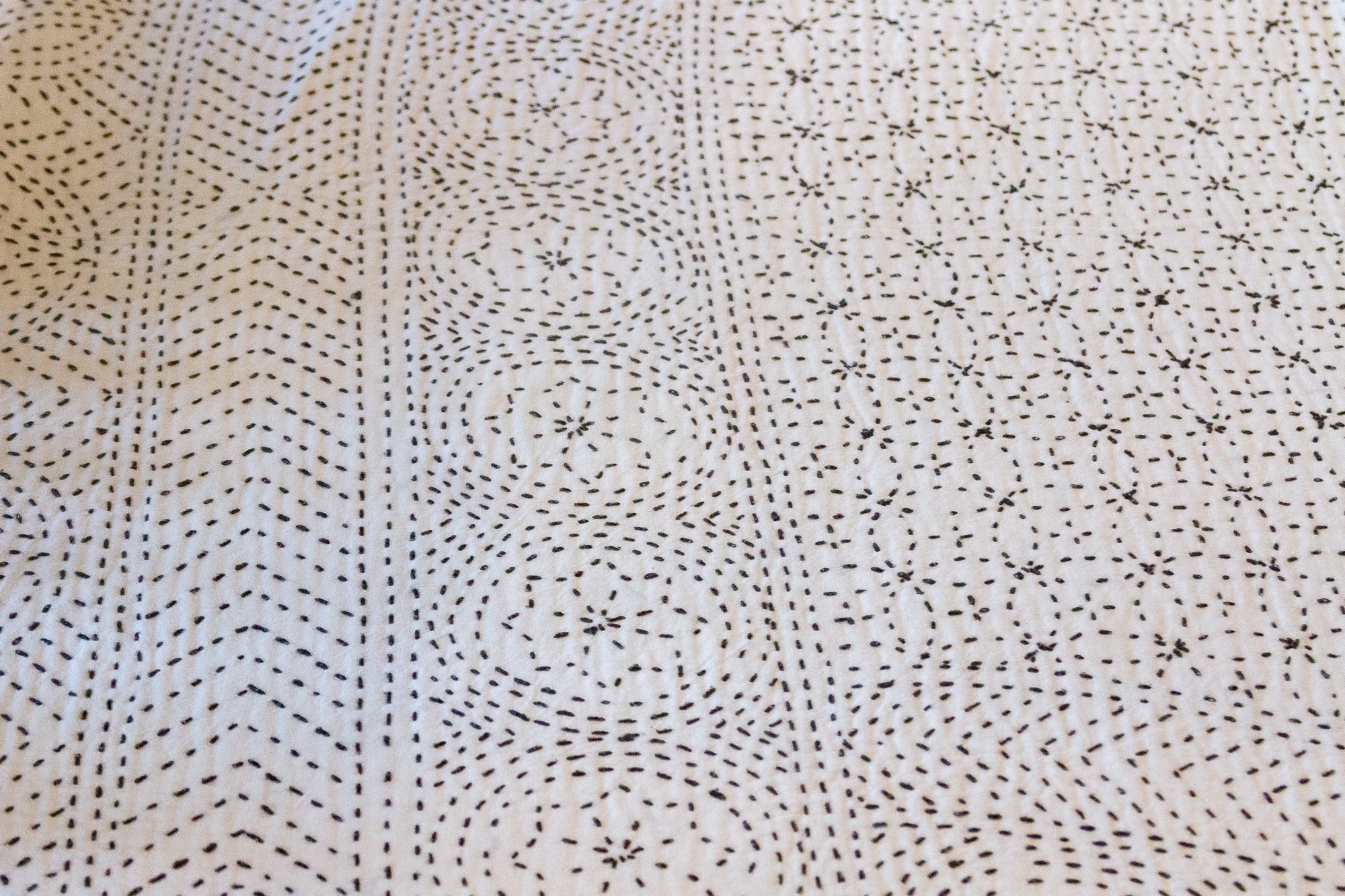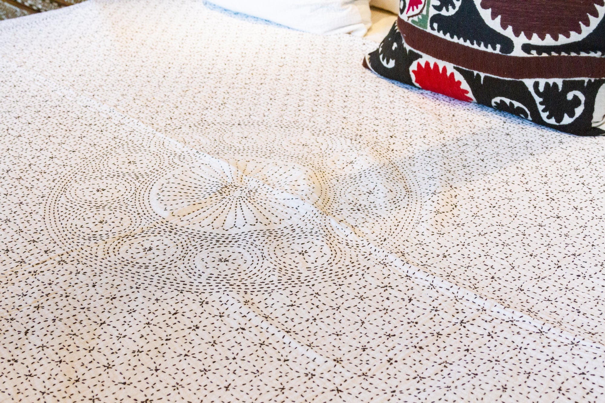 Celebrate the feminine with the handmade Filanan Gudari Bed Cover. This ornate textile is cotton based and adorned with the Meghval tribe's thread work. The embroidered medallions in this incredibly soft piece of art represent the circle of life.